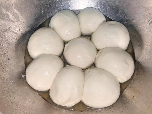 1. 面粉中加入温水,搅拌成面絮状,再揉成面团。此面团含水量较多,特别软且有些黏手,揉成团后盖上保鲜膜醒面10分钟,然后揉光滑。将揉好的面团分成均等大小的面剂子,表面抹上食用油,盖上保鲜膜常温放置一夜。