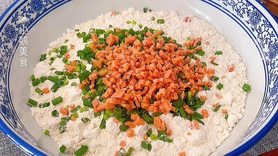 1. 几根小葱只用葱叶部分,切成葱花。一根火腿肠先切条再切成丁,切好后放入400克普通面粉里搅拌均匀。