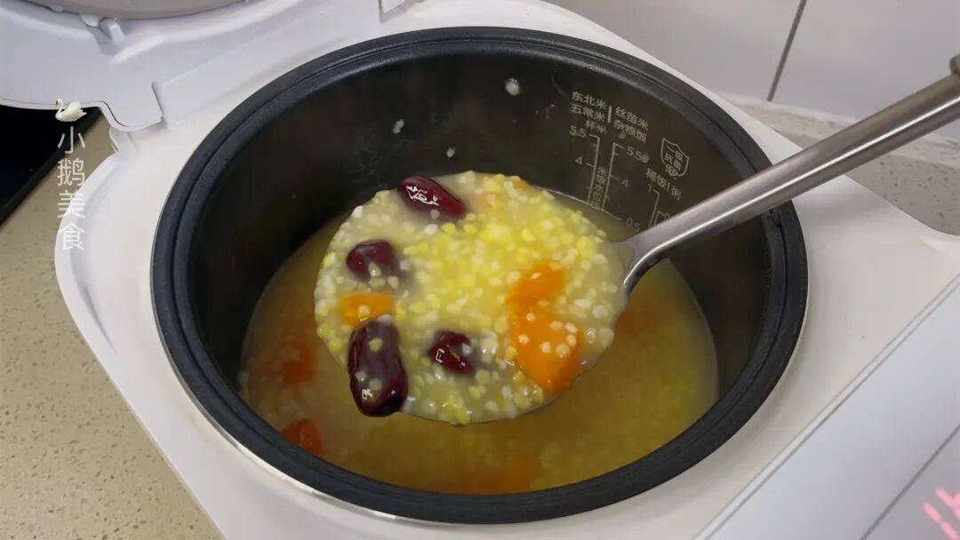 10. 稀饭是提前预约的,红薯切成小块,糯玉米碴子、红枣洗干净,都放电饭锅里,多加点水。根据家人喜好调整食材和水的比例,预约好时间,早上就能喝到温乎乎的稀饭,不用放糖,都是食材本身的香甜味,好喝又营养。