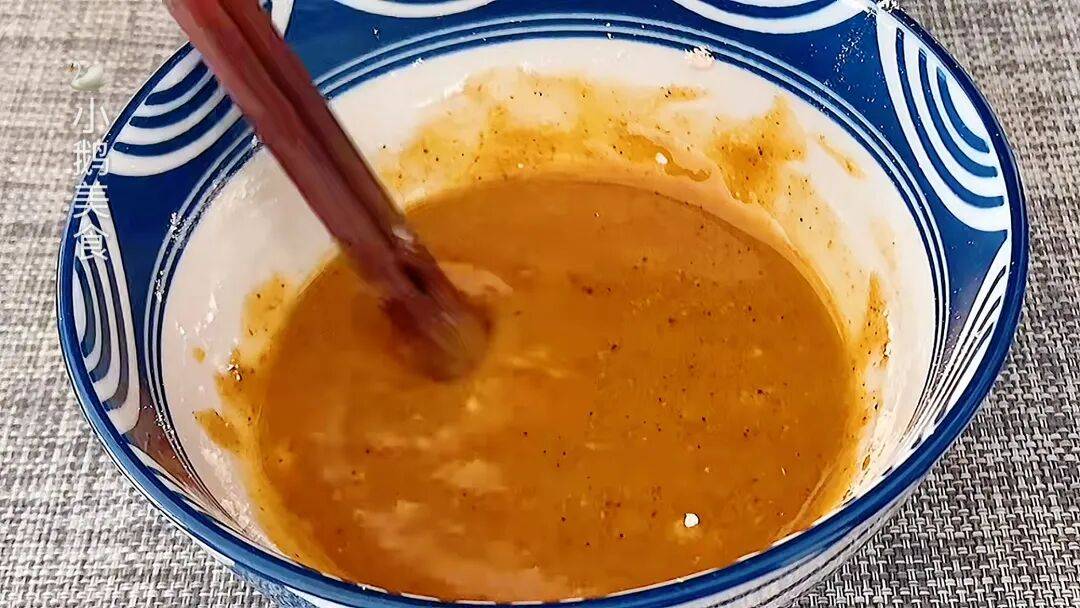 5,调稀油酥。小碗里加入2勺面粉、半勺盐、半勺五香粉、能吃辣的再放点辣椒面,浇上滚烫的熟油,调成酸奶状的稀油酥。