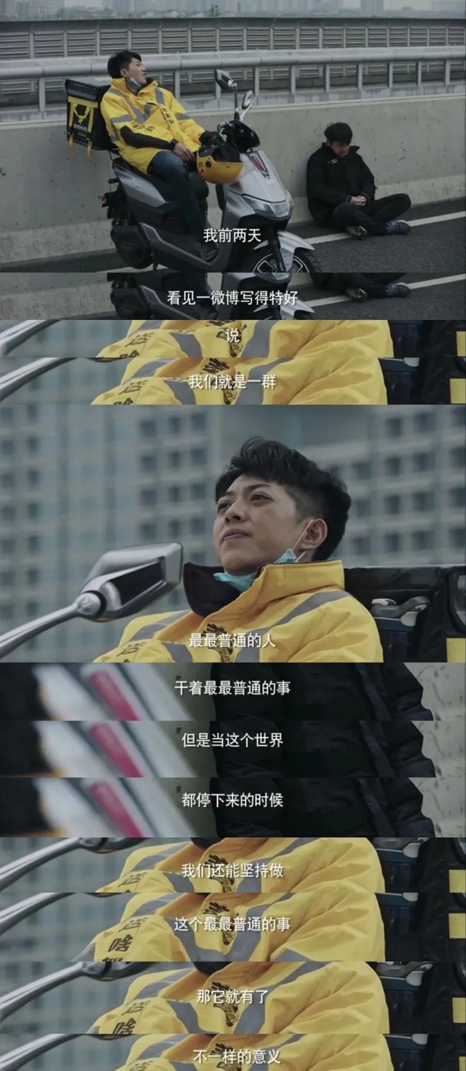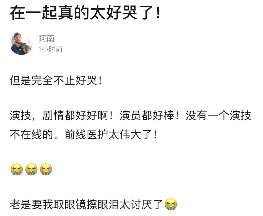 这个十一假期,电视报道中的武汉,仿佛已经一切如旧了:街道繁碌,公园里欢声笑语,卖米糕的小贩推着车吆喝……部分场合下人们不再戴口罩,大家开始亲吻拥抱。除了一些红外线设备还立在各个入口,这个城市中似乎关于疫情的痕迹开始渐渐隐去。 疫情向好的阶段,很多情绪也都逐渐开始淡化。还记得之前春节期间,师妹在几个志愿者群里,群里的求助信息24小时不曾断过,如今,群则是偶尔活跃,里面是简单的节日祝福; 而至于疫情期间师妹曾采访过的那些医护人员,车队志愿者,火神山志愿者,他们的朋友圈也恢复了各自的工作和学业日常。 对于那一段记忆,我们终究会遗忘吗?被眼泪一次次冲刷过的眼睛,还会再次被感动吗? 直到最近看到这部抗疫电视剧,才发现即便疫后时期,有些人,有些事,我们依旧忘不了,重温之时也依旧会感动。 在网上,很多网友都因它而哭,疯狂为它留言—— 十月份最大的催泪弹是它了! 这就是抗疫剧《在一起》。 关于抗疫剧或抗疫主题的纪录片,师妹不知道你们有看多少。但从目前师妹的个人角度来说,《在一起》算得上是目前拍得最真实,角度最全面的一部抗疫剧,没有之一。 从筹备之初,《在一起》就是备受期待。不同于以往的电视剧,《在一起》采用的创作方式是每两集一个独立的故事,全剧一共10个故事,20集,每集40分钟,每个故事由不同的导演和编剧分工合作,这使得《在一起》更像是一部接一部电影。 而看看《在一起》启用的团队,导演阵容中有拍摄《我的前半生》的导演沈严,《蜗居》导演滕华涛,《像雾像雨又像风》导演汪俊,《媳妇的美好时代》导演刘江等; 演员阵容更是庞大。目前《在一起》播出了4集,2个故事。 第一集《生命的拐点》故事中就有张嘉益、周一围、谭卓、张天爱、梅婷; 第二集《摆渡人》,故事主角是雷佳音、倪妮、张静初、蒋欣等。 而后续单元,还有陈数、黄景瑜、靳东、杨洋等几位。 而从目前播出的两个单元的故事来看比阵容更加吸引人的,就是《在一起》的故事剧本。 看点一:刻画平凡的伟大 《在一起》好看就好看在它的每一个单元所刻画的主角,几乎都是在疫情期间闪闪发光的普通百姓,且每一个人物几乎都有原型可追溯。譬如张嘉益所饰演的江汉医院老院长,对应的就是金银潭医院院长张定宇;看看这还原度—— 雷佳音饰演的外卖小哥,对应的也同样是疫情期间无畏地为患者送药送饭,去医院接送医护人员的普通外卖小哥; 杨洋饰演的乐彬,对应的是疫情爆发时,在上海进修,后来辗转回到武汉和同事们一起战斗的朱彬医生。 但在剧中更多的角色则是一些并不能找到具体的原型人物,他们既可以是一个个体,也可以是一个群体。而令人潸然泪下的就是这一群平凡的群体的故事。 比如第二个单元《摆渡人》里,雷佳音饰演的外卖小哥辜勇。作为在武汉打工的一位外卖小哥,辜勇和他的妻子文静一起租住在一个老旧小区中,夫妻俩的共同心愿是,尽快买新房,尽快搬家,生一个娃。 在武汉疫情全面爆发之前,辜勇其实很早就察觉到疫情的前兆。他发现叫外卖购买口罩,酒精和药品的人越来越多,药品断货的情况也越来越严重。 在向一位买药品的医生询问后,医生虽然没告诉他是否发生了非典,却有提醒他,以后尽量戴口罩,不要往医院跑。 剧中非常用心地展现了疫情的时间脉络。 从12月底到除夕夜前,辜勇一直遵循着医生的叮嘱,从不接医院的单。 然而转折就是在武汉封城的当夜,从新闻上获悉武汉疫情的辜勇,却偏是在人们蜂拥离城之际,以一腔孤勇自愿选择了留下。 起因为何?无非是他前一日接了一单给患者家属去医院送免疫球蛋白的外卖。然而当他去到医院时,却见到满目的慌乱、绝望。 你说他怕不怕?这个滑稽的游泳眼镜似乎说明了一切。 再注意这一个镜头,没有声音,只听得到沉重的呼吸声。 然而当看病的老太婆没有口罩,向护士讨,护士说没有时,转头他就拿出一个,递给了老太婆。 这是他迈出善的第一步。 于是才有后面的故事。除夕夜,武汉即将封城,妻子计划与他一起开车回老家。然而堵在半路上,他突然给妻子交代“后事”,转头就跳下车离开。 这是一个信号:“明知山有虎,偏向虎山行”。 而更令人感动的是妻子的反应。妻子文静明白为何丈夫想要选择留下。她一边嗔怪赌气,一边却跟着丈夫回到了武汉的家。 夫妻有难同当,这是另一层平凡的感动。 除夕夜当天,做厨师的朋友,把爱心餐钱赚了却不敢给医护人员送餐,电话给他。妻子责怪对方,自己不敢送,凭什么让我的丈夫去送。 但转过头,辜勇却穿好了外卖员的衣服。 妻子责怪过他,你逞什么能? 而他只为了让医护人员吃一口热乎的年夜饭,便义不容辞开车前往。深知丈夫脾性的文静,只能说一句,“你给逞完能,平平安安地回来。” 辜勇,辜勇,却不曾辜负勇敢。辜勇的善,是从来不求所图。 与他同样做外卖骑手的同行,抱着小心思返回武汉。但他却只有一个信念:我只想让武汉好起来。所以他会为失去了奶奶的女孩找感染在医院的爸爸。 会坚持免费送医生护士们上下班,也会劝阻误以为要自杀的陌生男子。 他因疫情当下,人却无能为力的情况而泪流满面。 也会在援鄂医疗队到达时热泪盈眶。 更会在武汉人民呐喊时,不由自主地成为了记录者。 他不是武汉人,却深爱着武汉人。 你说他是英雄吗?他其实只是做着普通的事;你说