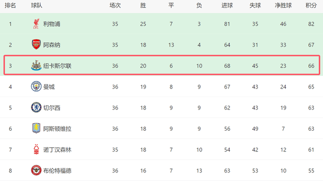 这场比赛过后,英超争五的形势已经发生了变化。加上本场比赛,纽卡斯尔在主场迎来了6连胜,正是凭借主场的强悍表现,纽卡斯尔已经反超了曼城,杀进了积分榜前三的位置。本轮比赛,曼城在客场被南安普顿逼平,爆出了大冷门,这也给了纽卡斯尔机会,后者有机会以前三名结束这个赛季。