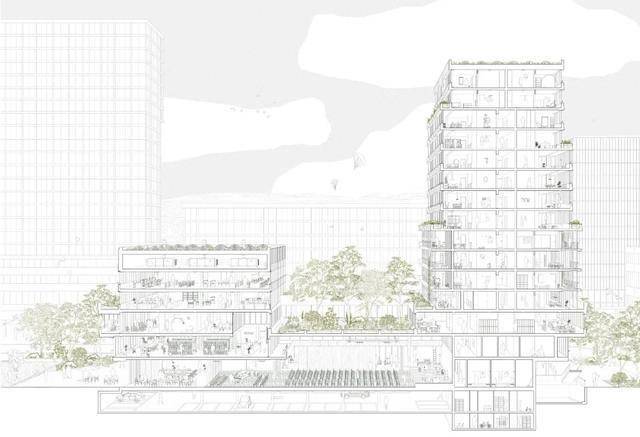 该建筑面向多种用途,促进了不同使用者之间的互动。其立面设计搭配绿色的凹凸空间,体现了切实的开放性。这种开放性不仅体现在物理空间上,还体现在功能和使用人群上。建筑内可能设有商业空间、文化展示空间、社区服务空间等,不同功能区域相互穿插,使得居民在购物、参观展览、办理事务等过程中能够相互交流,促进了社区的信息流通和人际关系的发展。