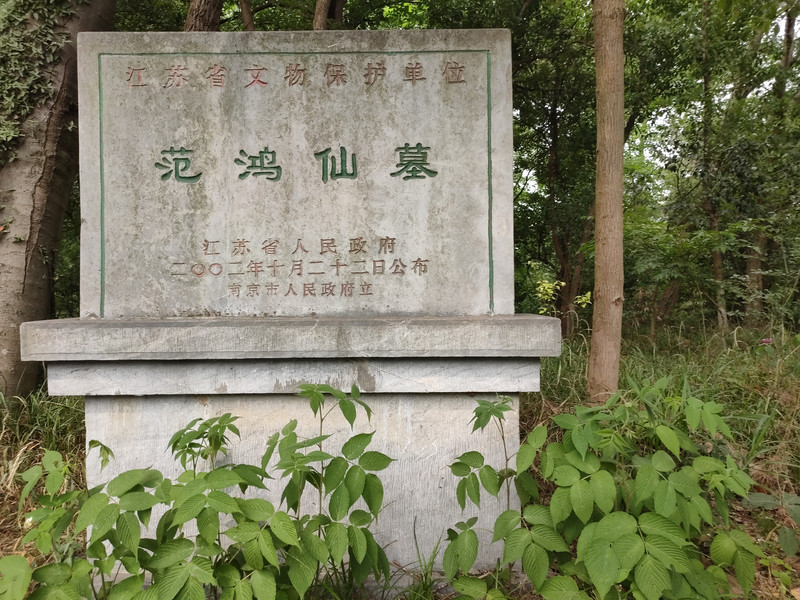 下山后因选择另一侧路线,距离初始停车场较远。在寻找交通时意外发现了范鸿仙墓。该墓位于东马腰东坡,有两柱牌坊刻“烈士范鸿仙墓道”。范鸿仙(1883-1914),安徽合肥人,同盟会成员,《民呼日报》主笔,1914年在上海被袁世凯派刺客杀害,年仅32岁。墓地历经抗战与十年动乱损毁,1972年由江苏省政府修复,并迁葬其夫人李贞如遗骨。孙中山曾承诺为其举行国葬,1936年国民政府追赠其陆军上将衔。