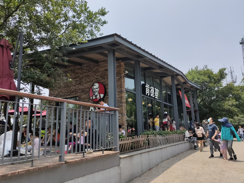 在中途休息了一会儿,我们一鼓作气,登上了紫金山主峰西侧的头陀岭,因为古时岭上有头陀寺而得名。岭上巨石壁立,山峰险峻,是居高临下饱览湖光山色的好地方。紫金山观光过道的终点就在这里,居然还有肯德基。虽然还没有饭点,不过爬得挺热,于是去买了甜筒。游客很多,这里也只有这么一家店,所以得排队。既然好不容易排了队,干脆就把午餐也给一起买了,就是早一点吃午餐了。我们也不知道后面有没有餐厅,还是在这里吃饱喝足了比较安心。