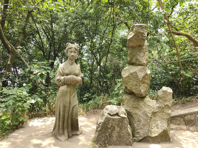 道生说法,顽石点头的景点取材自佛经的故事,原意是晋朝和尚道生法师对着石头讲经,石头都点头了,可见道生法师佛法之高深。除了道生法师讲经的坐像,还有一尊女性面对石头的石像。