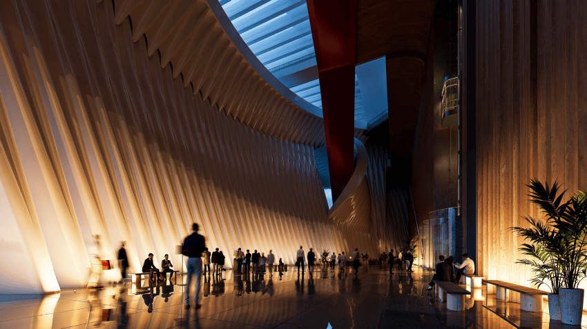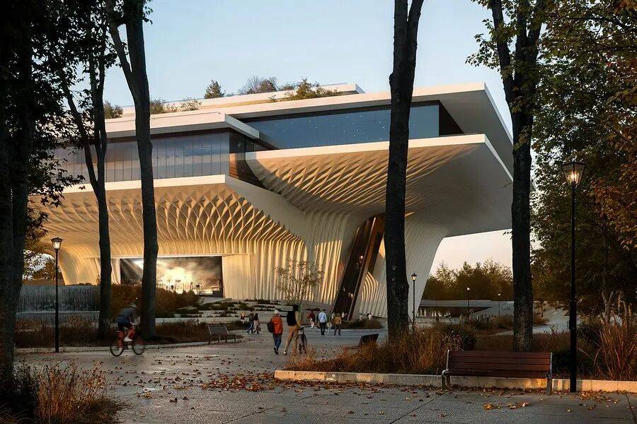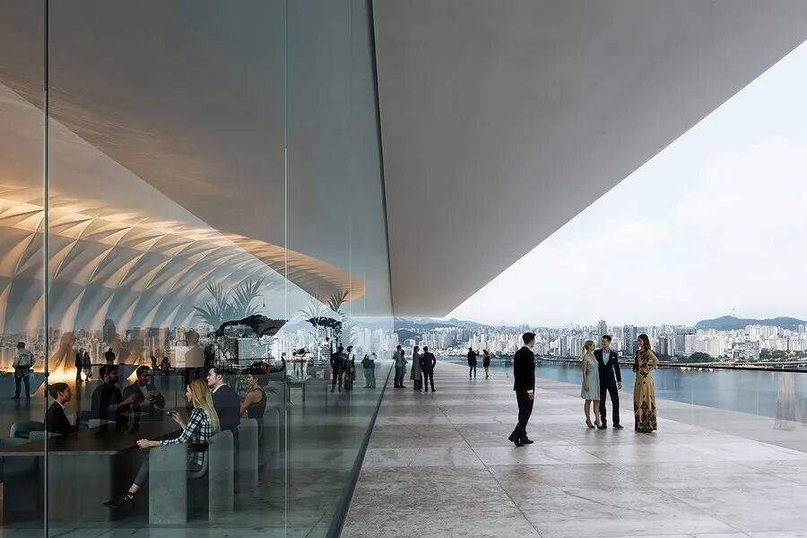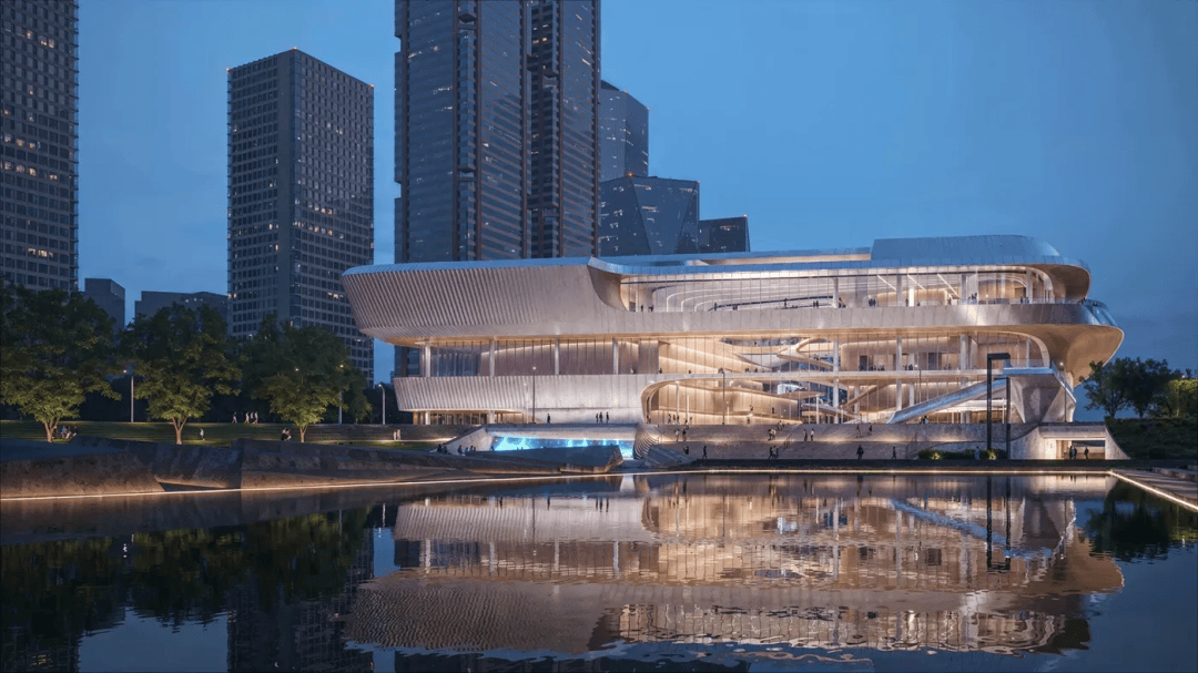 其余四个入围方案风格迥异,从不同维度诠释了建筑与自然、城市的关系。有的侧重通过椭圆形建筑与地势结合,衔接绿地和金融区天际线;有的深挖本土文化,用传统屋檐元素营造开放空间;有的凭借透明外立面模糊建筑、景观与社区的边界;还有的以弧形屋顶和特色空间串联汉江与公园,这些方案虽未中标,却也展现了国际建筑界对文化地标设计的多元探索。