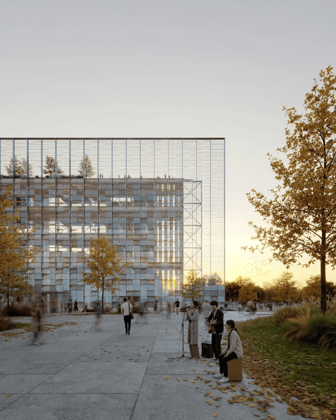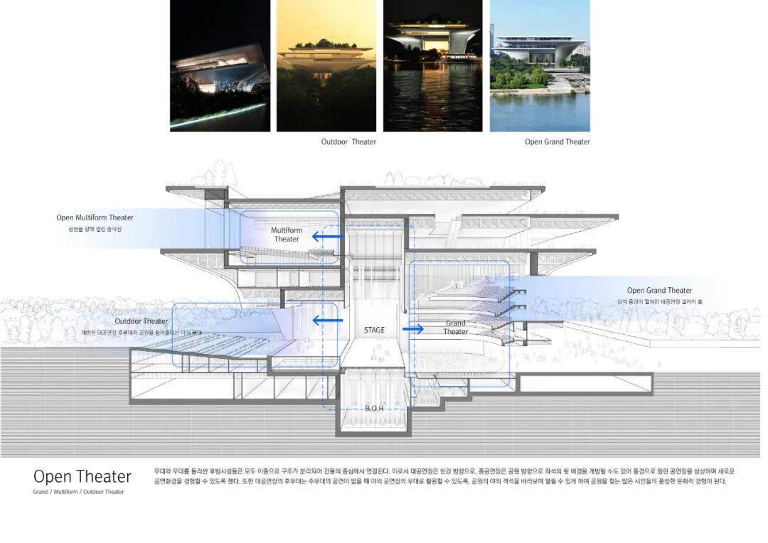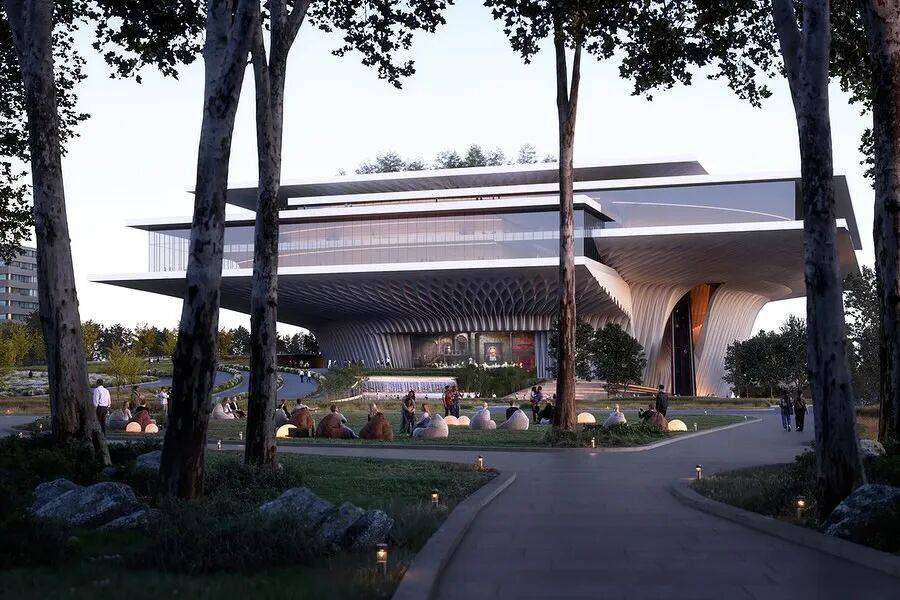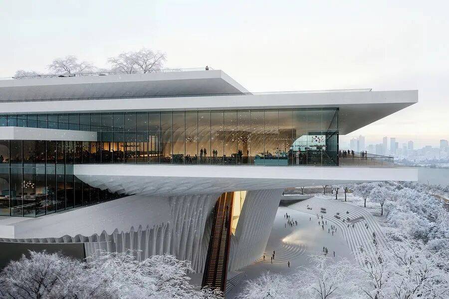由designcamp moonpark dmp和King Young-min合作的方案,以表演厅为核心的设计极具巧思。流畅的屋顶线条搭配多层结构,再加上屋顶花园与露台的融入,让建筑既能融入汝矣岛公园和汉江滨水区的自然环境,又能凭借独特造型成为城市新地标。而汝矣岛广场的设计更是打通了表演场馆与城市日常空间的壁垒,让这座大型文化建筑不再有疏离感,充分满足市民日常休闲、公共活动等需求,凸显公共属性。