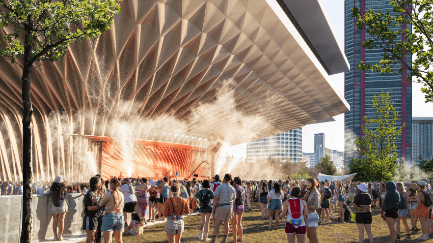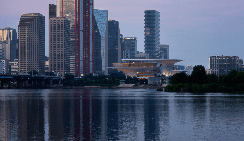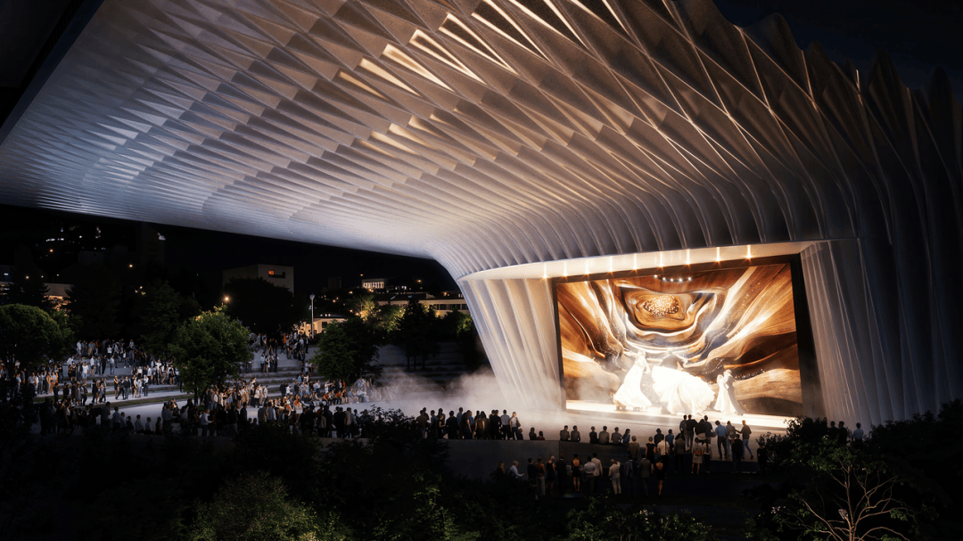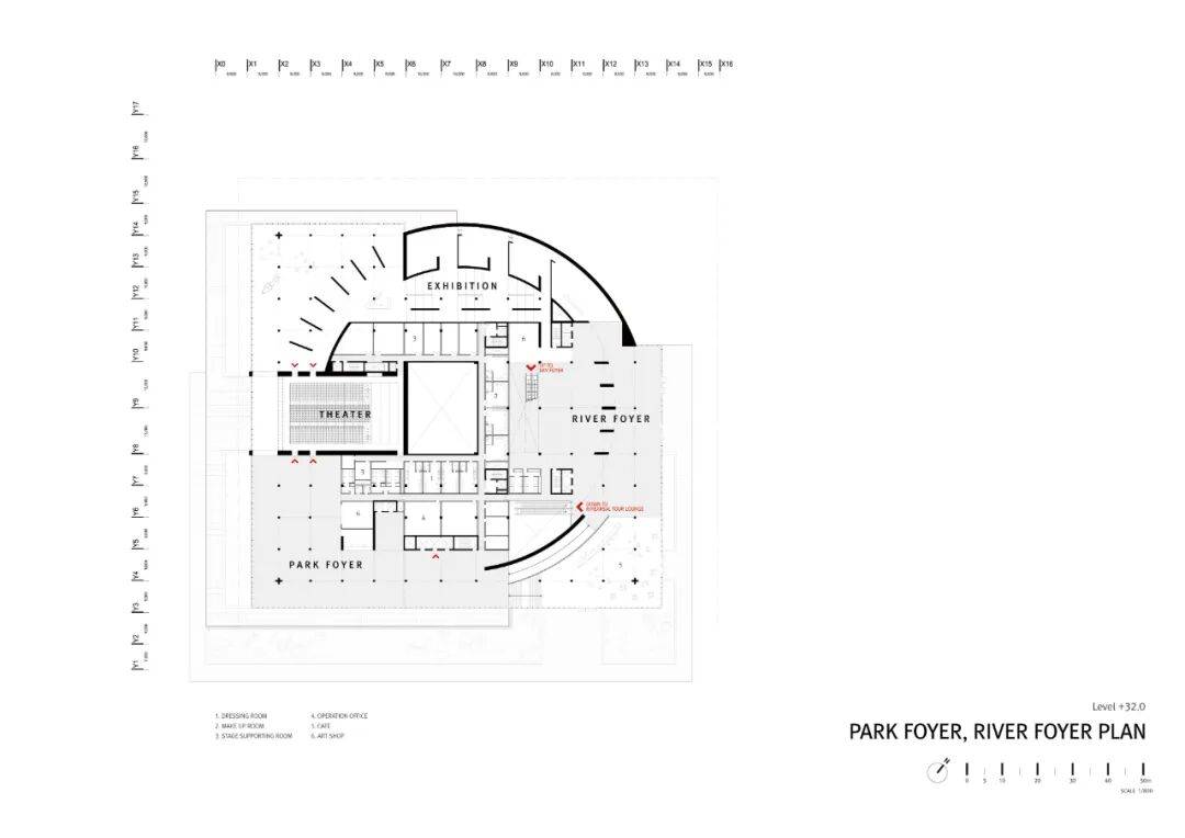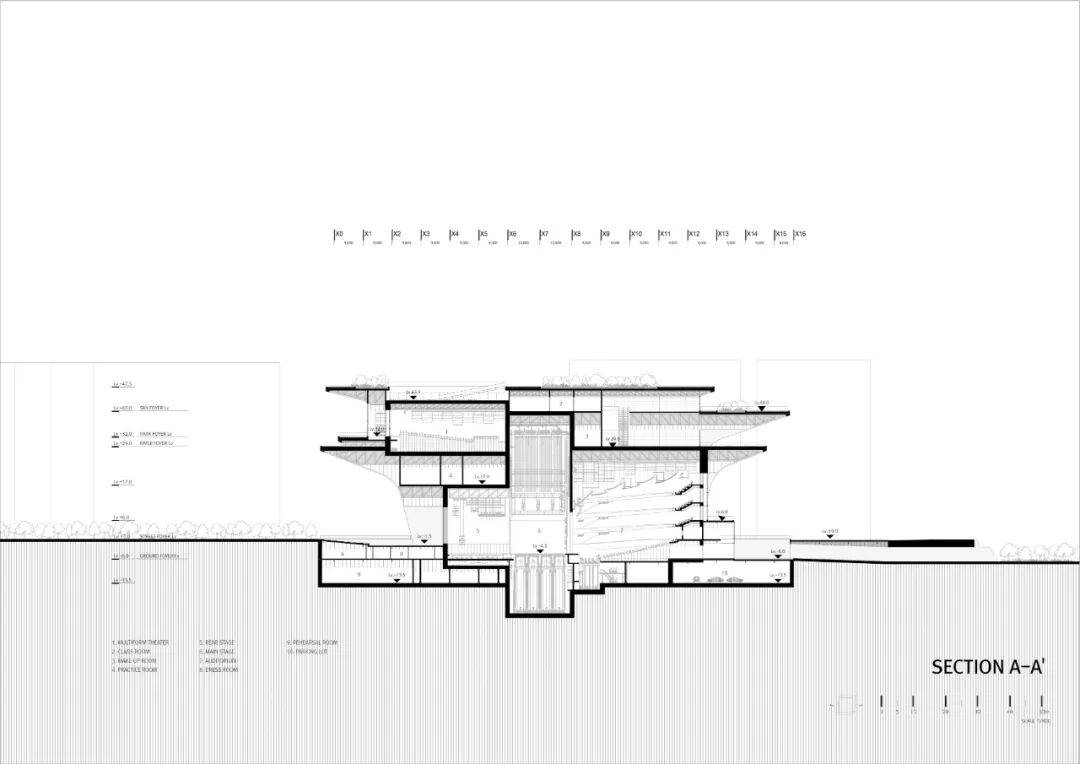 由designcamp moonpark dmp和King Young-min合作的方案,以表演厅为核心的设计极具巧思。流畅的屋顶线条搭配多层结构,再加上屋顶花园与露台的融入,让建筑既能融入汝矣岛公园和汉江滨水区的自然环境,又能凭借独特造型成为城市新地标。而汝矣岛广场的设计更是打通了表演场馆与城市日常空间的壁垒,让这座大型文化建筑不再有疏离感,充分满足市民日常休闲、公共活动等需求,凸显公共属性。