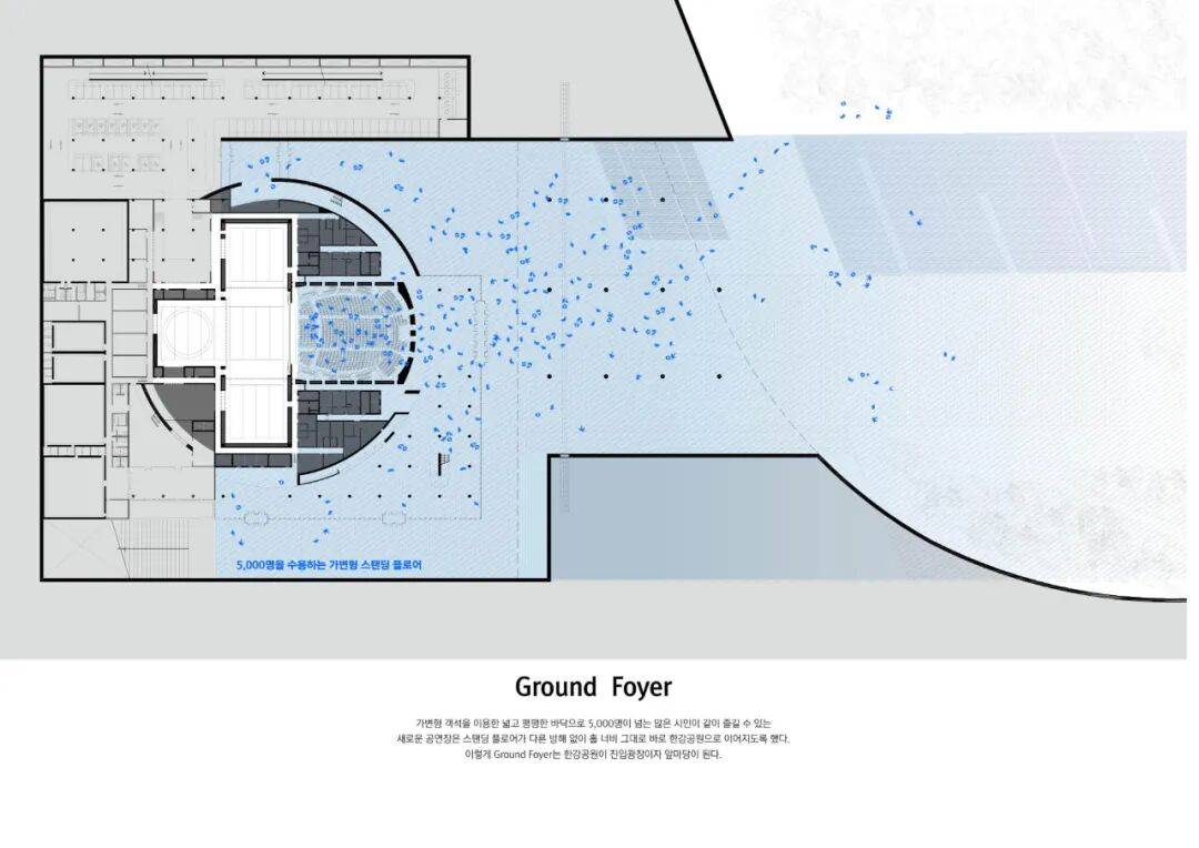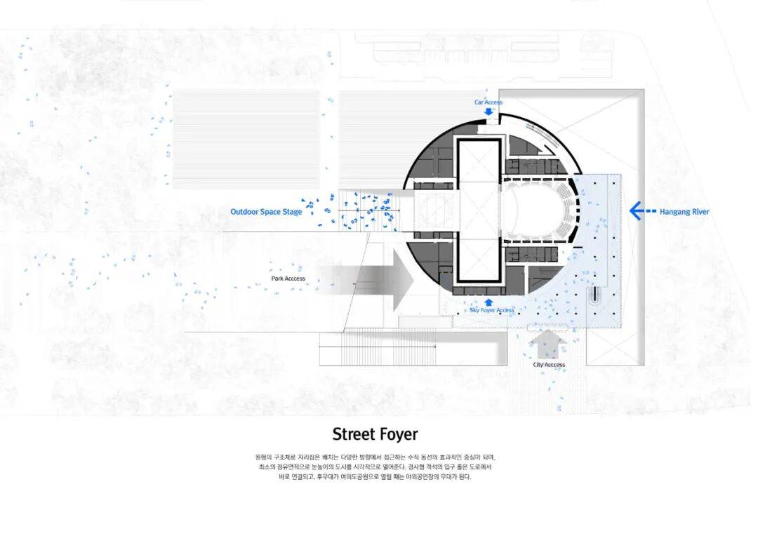 设计竞赛评审的重点在于建筑的象征意义、与自然环境的联系及其公共属性。获胜的dmp 团队方案以表演厅为核心,设计流畅的屋顶线条与多层结构,并融入屋顶花园和露台,使建筑在回应场地环境的同时塑造出新的城市地标。汝矣岛广场的设计进一步强化了表演厅与城市日常空间的衔接,兼具开放性与公共性。