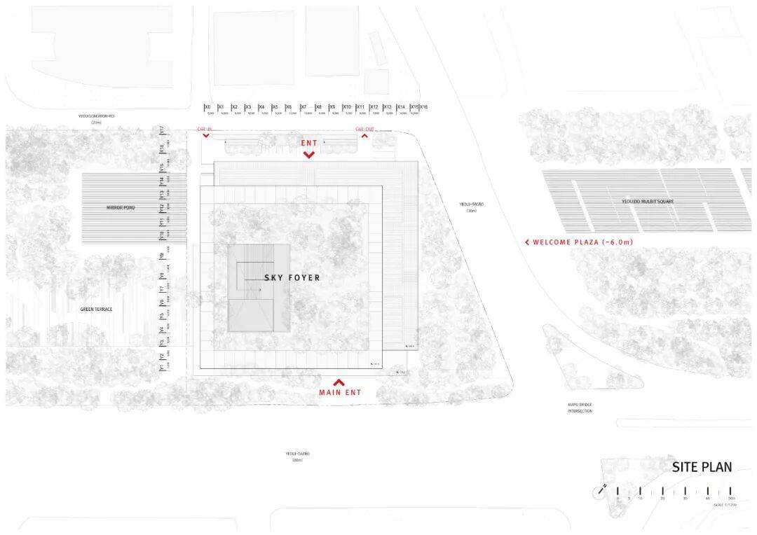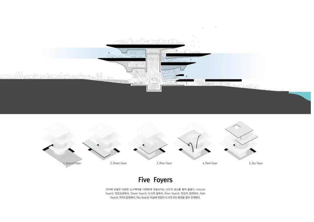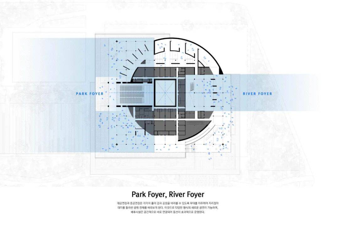 由韩国建筑公司designcamp moonpark dmp 与首尔大学景观建筑系教授 King Young-min 合作设计的第二世宗文化中心项目,在历时两年、分为两个阶段的国际设计竞赛程序之后最终胜出。项目选址于首尔汝矣岛公园北侧,作为“大汉江工程”的核心组成部分,规划涵盖多功能文化设施、滨水文化公园、城市绿地广场与生态公园。其目标是在汉江沿岸打造一座具有世界级影响力的文化地标,同时延续并升级光化门世宗文化中心的空间品质与城市文化服务功能。