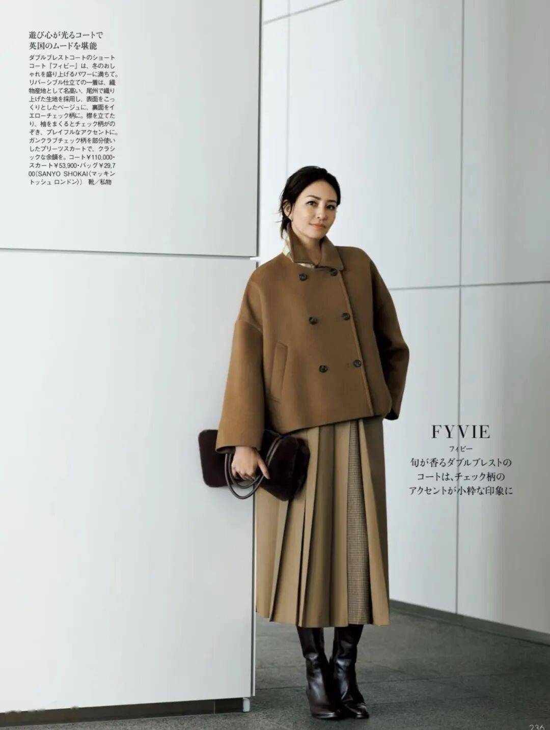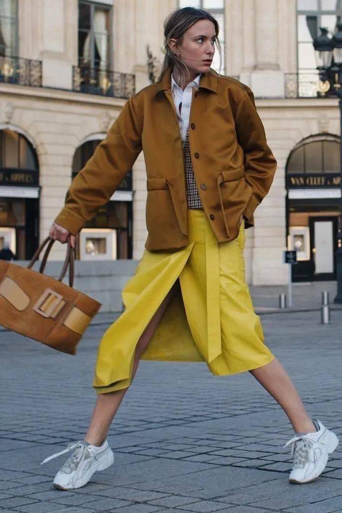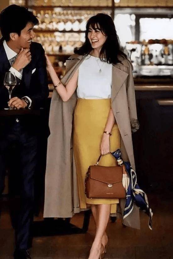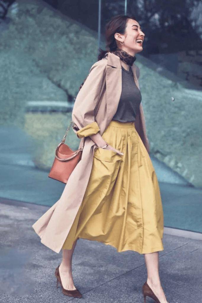 - 下装提亮:淡黄色半裙内搭风衣,既显瘦又提气色。