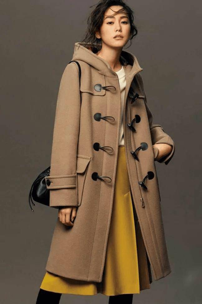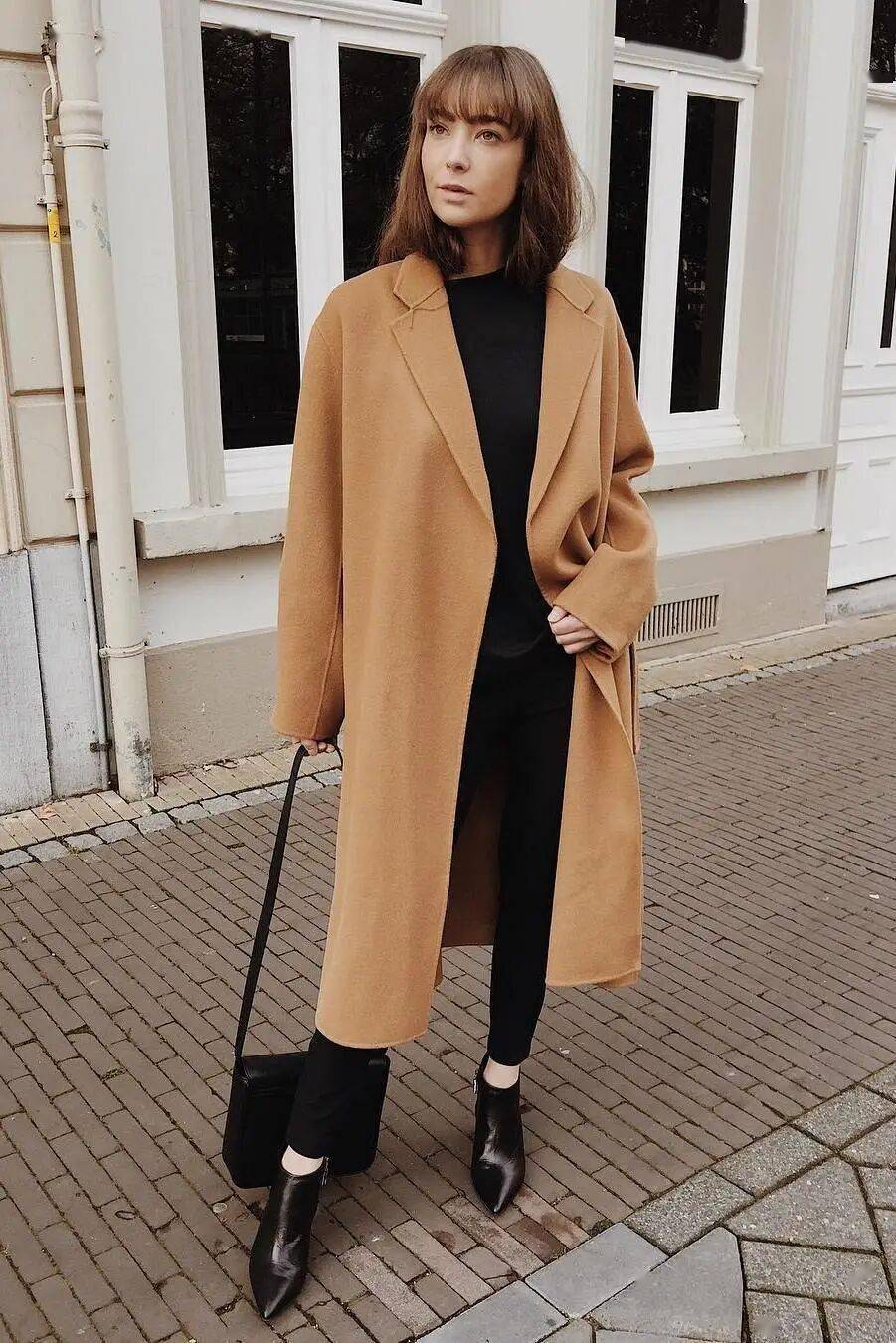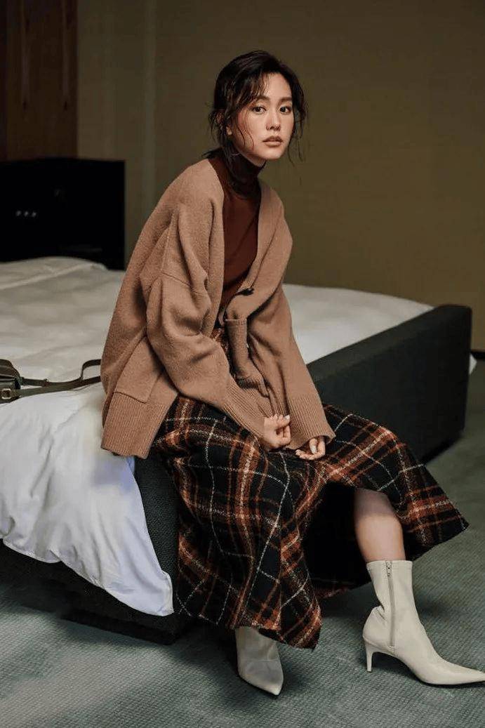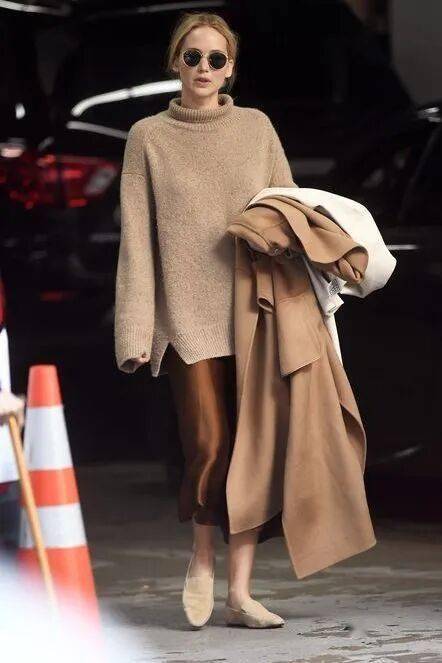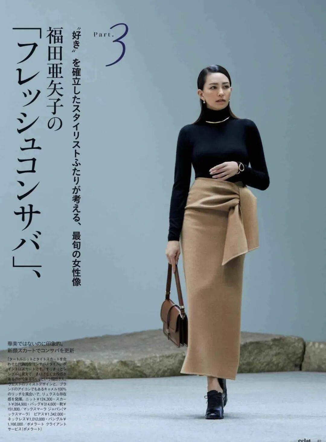 - 外套+全身内搭:大地色外套+黑色高领毛衣+黑色裤子,层次分明。