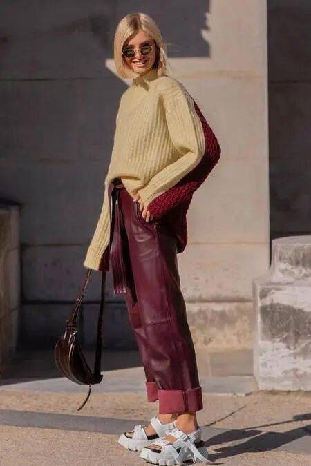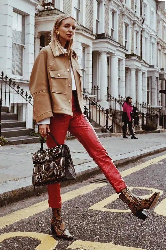 - 红裤装:酒红色裤子+大地色针织衫,易驾驭且显腿长。