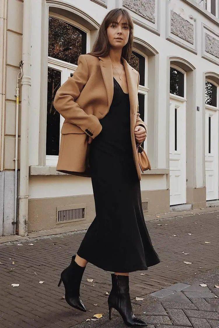 - 约会聚餐:驼色大衣+酒红色连衣裙+小红包,复古优雅。