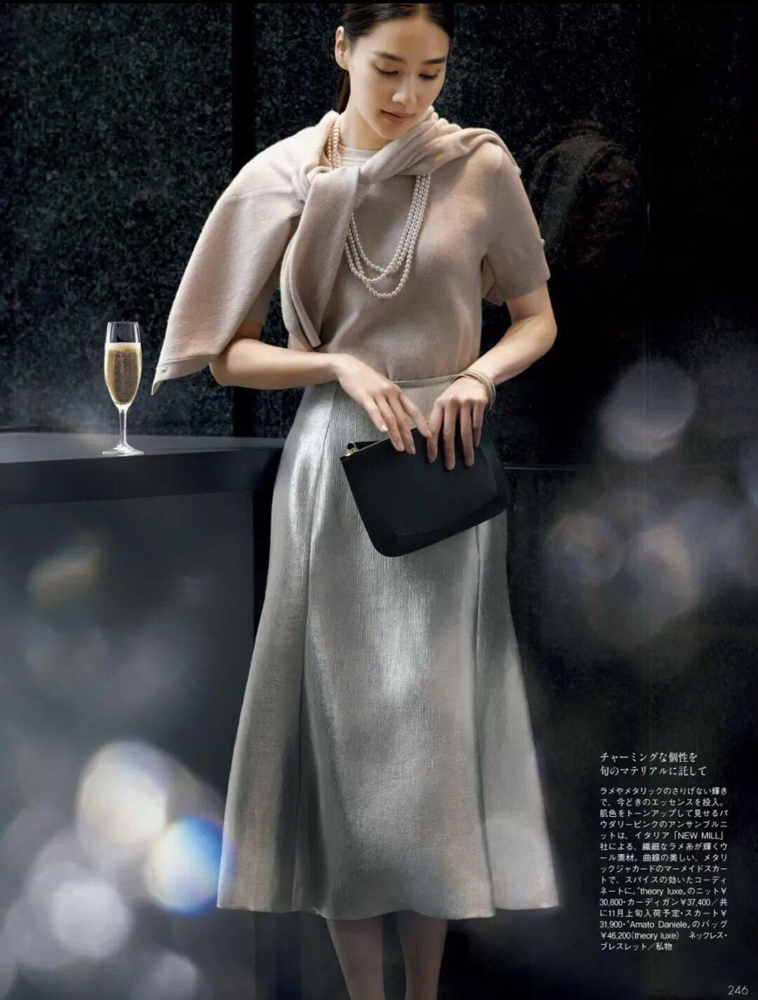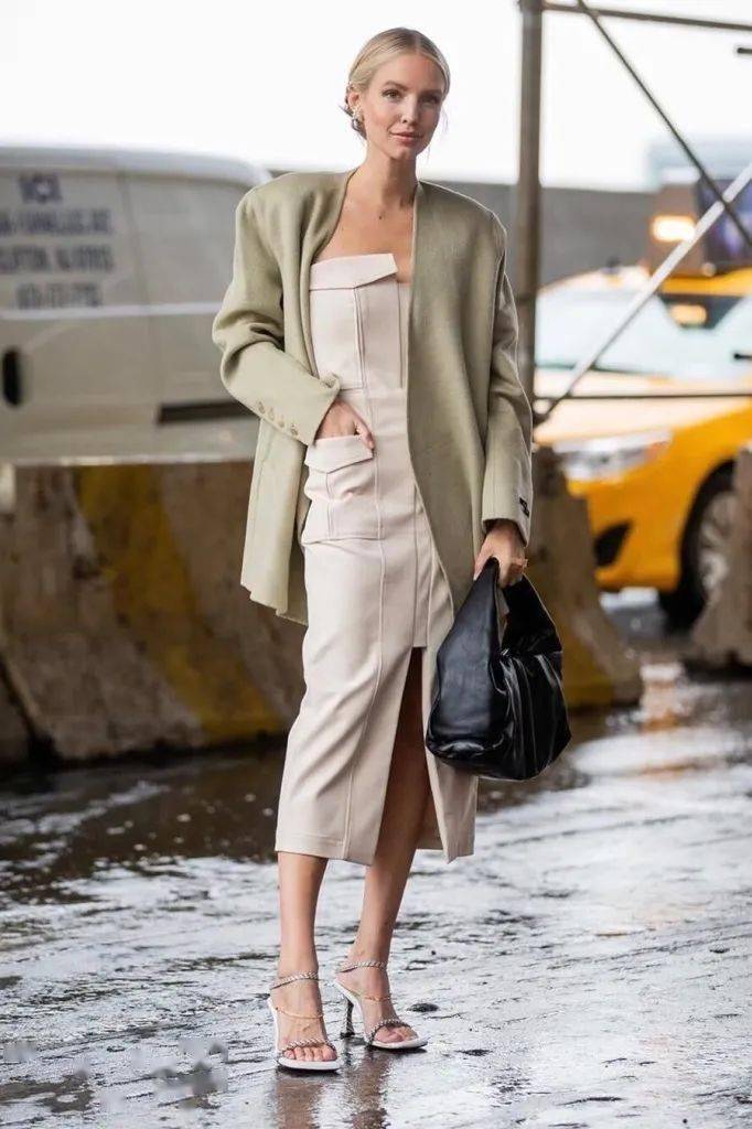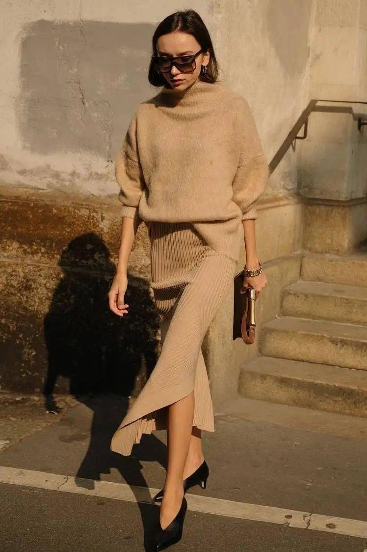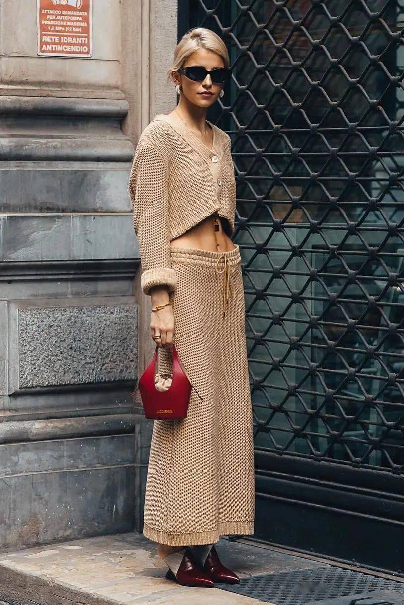 - 面料对比:针织与丝绸、不规则针织套装的轮廓对比,增加时髦感。