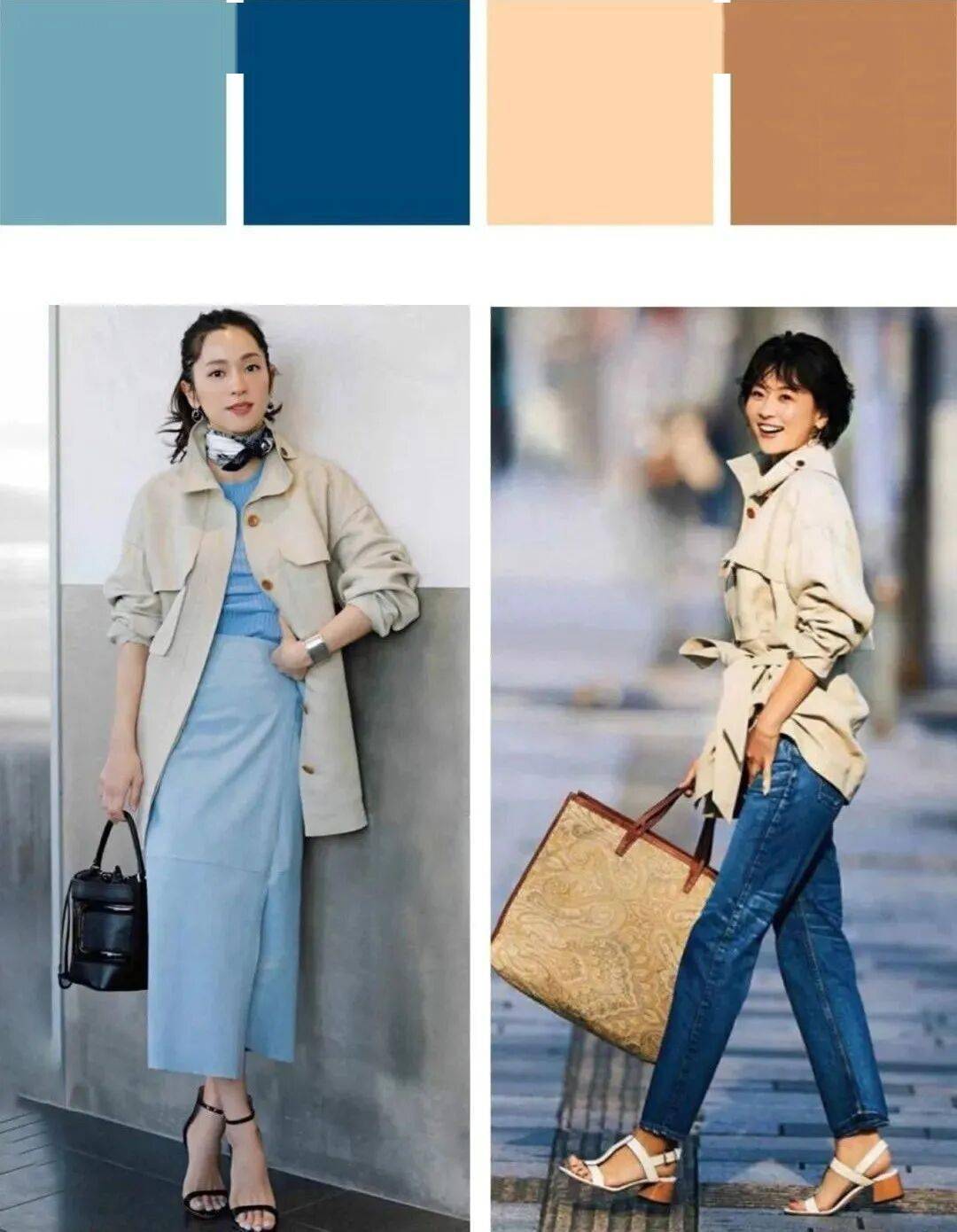 - 深浅对比:浅蓝配浅卡其、深蓝配焦糖色,层次分明。