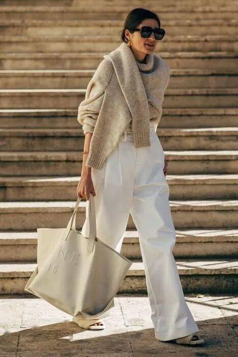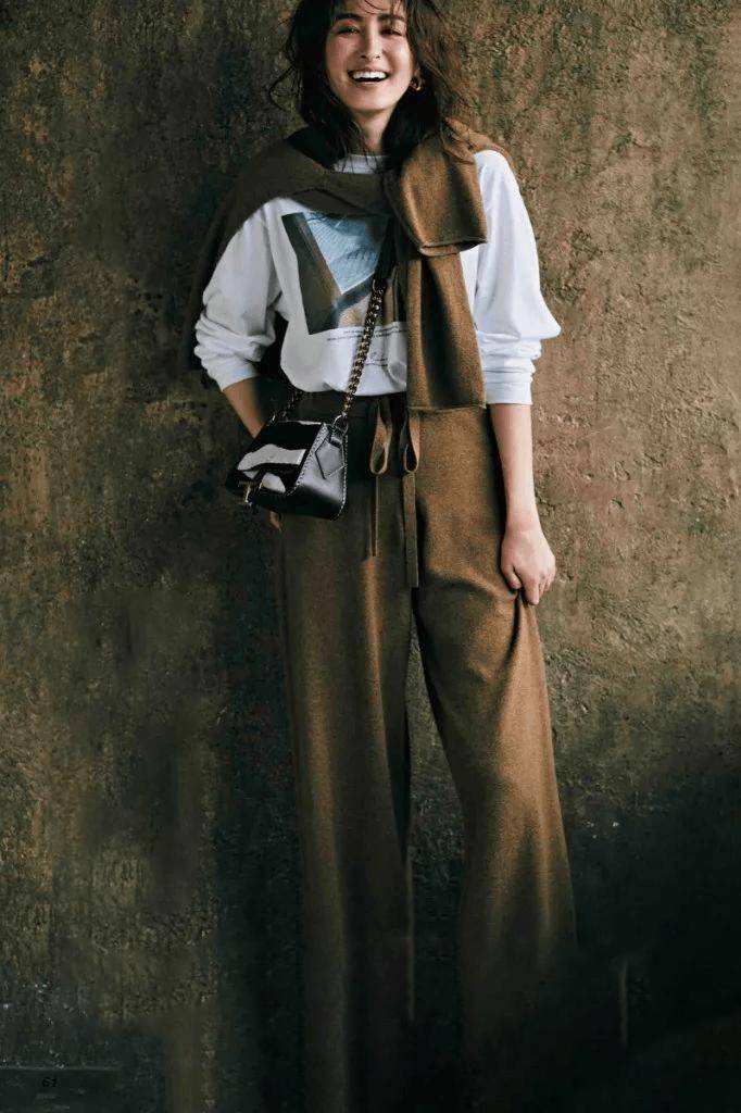 - 休闲穿搭:白色针织衫+驼色阔腿裤,慵懒随性。