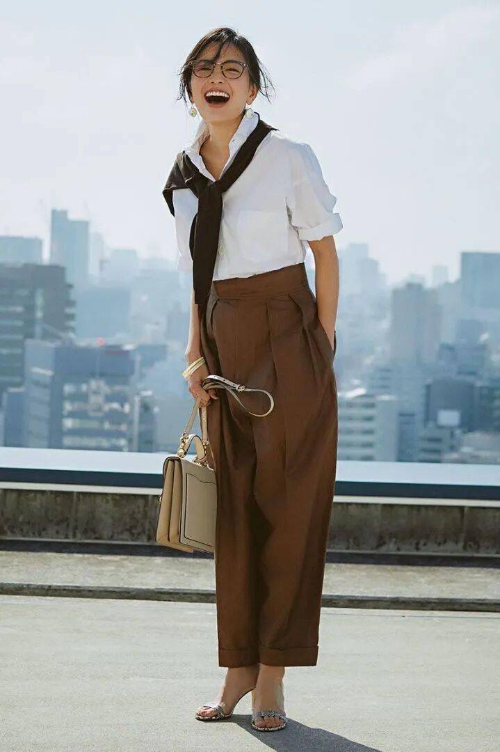 - 职场穿搭:白衬衫+大地色裤装,针织衫当披肩,知性优雅。
