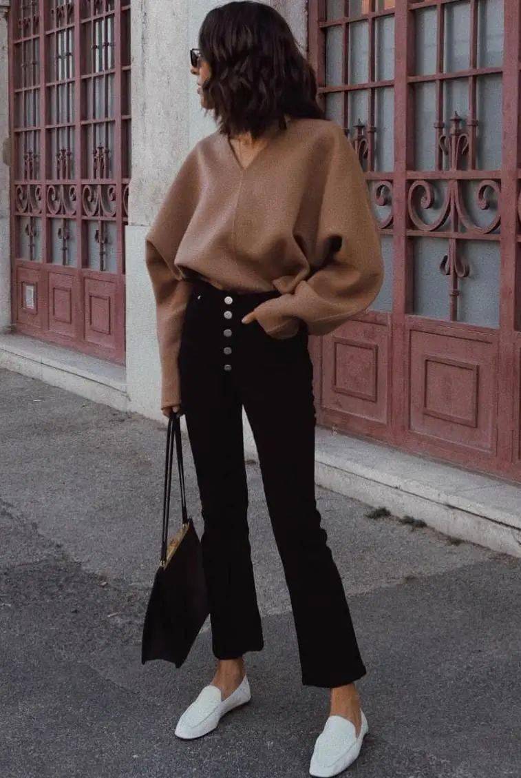 - 上下穿:黑色高腰微喇裤+大地色短上衣,显高修腿。