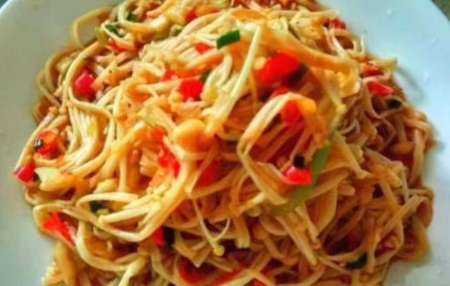 材料:金针菇、酱油、黑醋、小米椒、干辣椒、葱、蒜