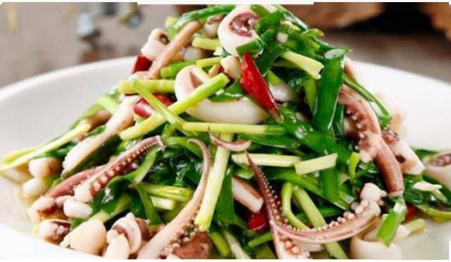 食材:韭菜、鱿鱼须、 酱油、料酒、十三香粉、精盐、 味精