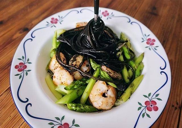 特点:墨鱼汁意面的黑色神秘感搭配芦笋的清新与虾仁的Q弹,口感丰富,颜值与美味并存。