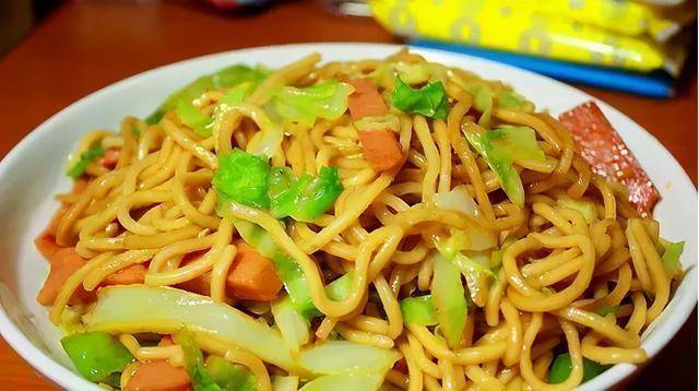 2. 炒制蔬菜与面条:热油爆香姜蒜末,放入包菜丝等蔬菜中火炒软。加入面条和料汁大火翻炒均匀。