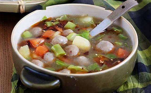 5、将土豆、胡萝卜、豆角都切成小丸子大小地块,圆白菜撕成小块,将骨头汤放入锅中,放入盐,放入小丸子煮熟捞出;