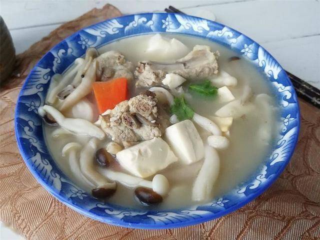 所需材料:豆腐1块、排骨400克、蟹味菇100克、白玉菇100克、胡萝卜1/2根、盐适量、葱1段、姜2片、料酒1汤匙、胡椒粉1/2茶匙 做法: