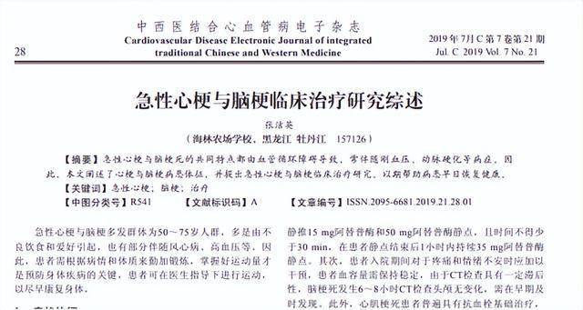 急性心梗与脑梗临床治疗研究综述,张洁英,中西医结合心血管病电子杂志,2019-07-24