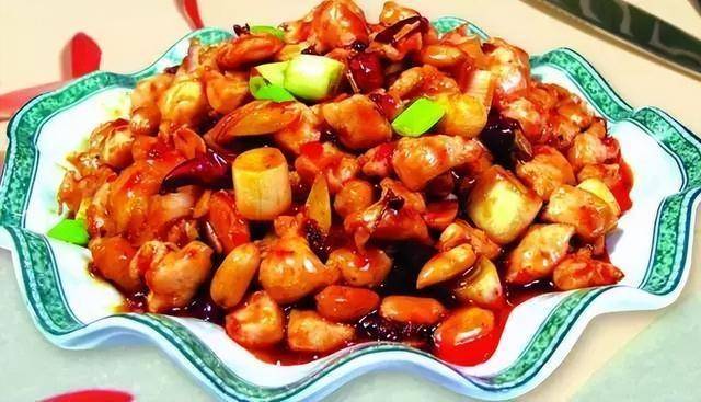 5.锅中留底油,烧热后将花椒和干辣椒放入,用小火煸炸出香味,随后放入大葱段、姜末、蒜茸和鸡丁翻炒片刻,最后调入芡汁,待汤汁渐稠后放入花生仁拌炒数下即可。