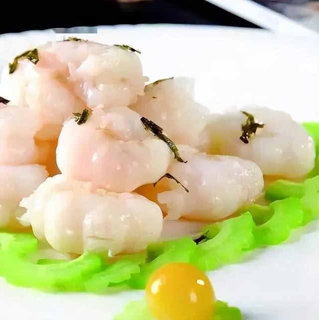 做法:1、在牡丹虾的背部划一刀,飞水后卷裹成虾球,冰镇待用。