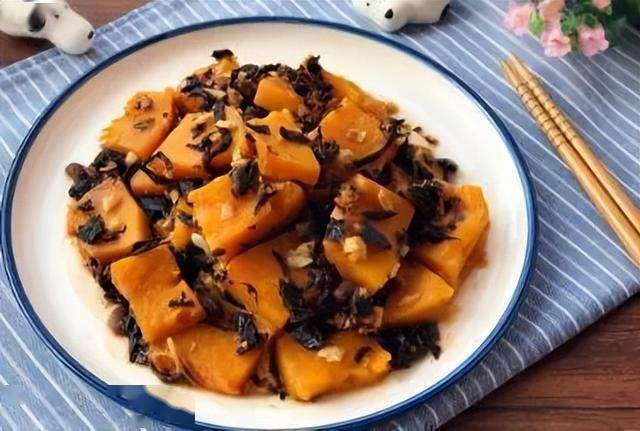 材料:南瓜300克,水发梅干菜200克,豆豉300克,葱花、姜末、蒜末各少许。盐2克,食用油适量