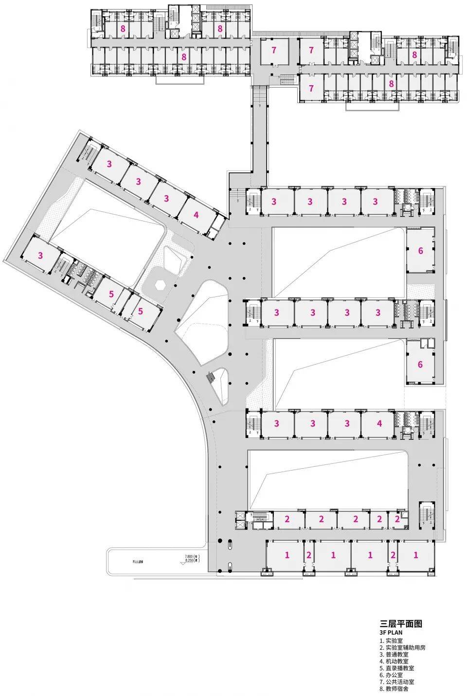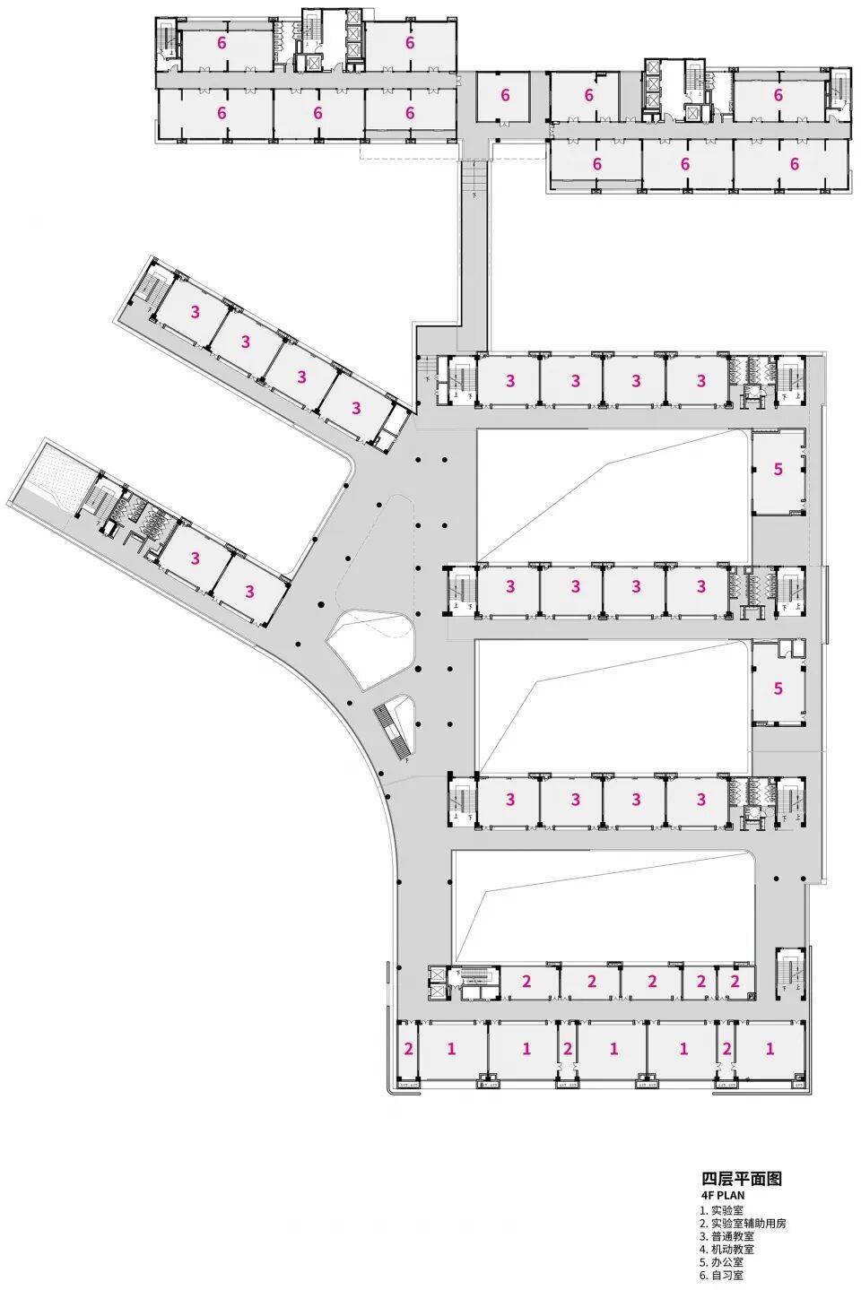 本案的教学空间布局集约且简明:音乐、美术、舞蹈教室集中设于艺术楼,所有普通教室、图书馆及各学科实验室,则均集中在教学综合楼内。教学综合楼中央的核心中庭,空间层次丰富、递进有序,且自然光线充沛,堪称教学楼的 “空间心脏”——以它为中心,聚合起所有教室、图书馆与实验室。未来这里的使用场景将多元而鲜活:可陈列学生的科创作品展,可举办小型读书会,甚至能让社团搭建临时舞台、开展各类展览活动,成为激发学生自由活动的 “场景引擎”。