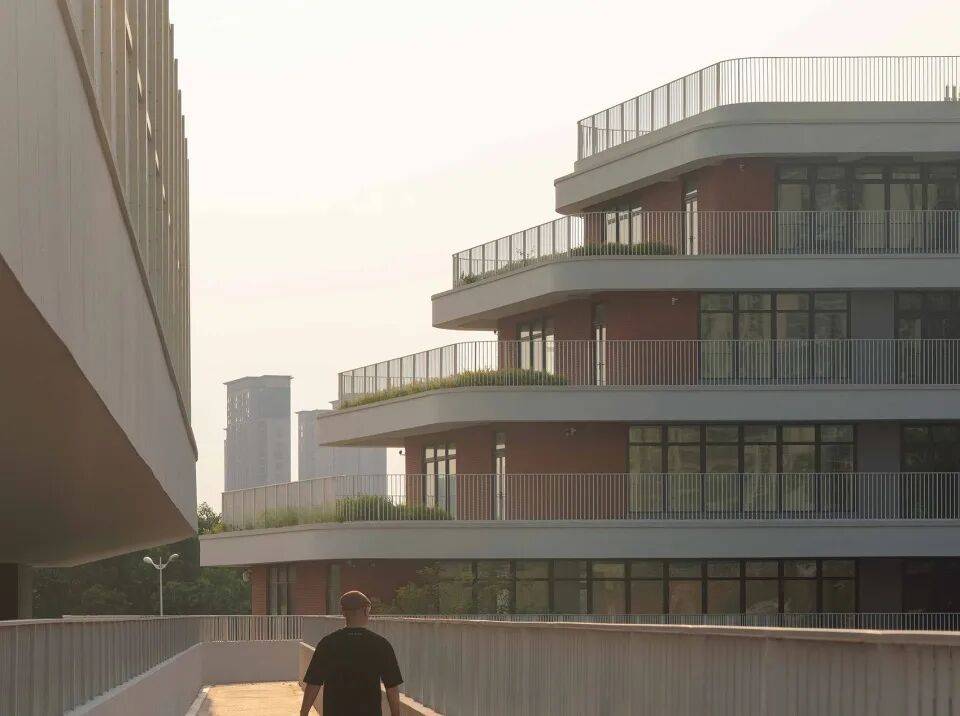 1. 层层退台设计:学校依托场地东北高、西南低的自然坡度,顺着不同尺度空间需求叠造出层层退台。教学综合楼退台逐级延伸至礼堂、运动馆,学生凭栏可远眺五缘湾湿地公园景致与落日余晖;宿舍楼平台与阳台朝向厦金湾,落日晚霞会将红砖铺就的连桥、平台与走廊染成橙色调。