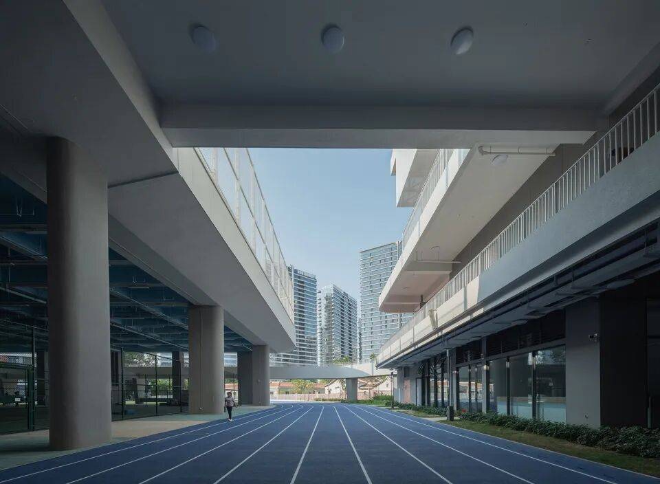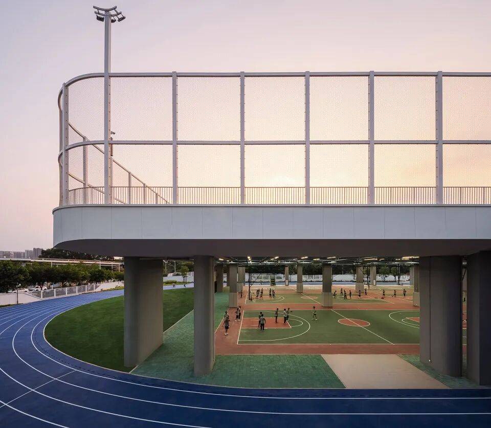 2. 架空运动场:架空的运动场如悬浮巨型露台,向外承接湿地公园绿意,可远眺环岛干道街景;向内能俯瞰跑道上奔跑的同学身影,拉近了自然、城市与校园的距离。