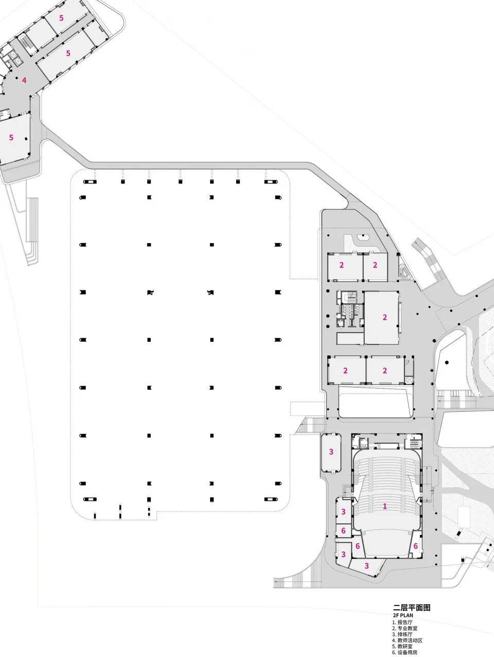 1. 教学空间布局集约:音乐、美术、舞蹈教室集中设于艺术楼,普通教室、图书馆及各学科实验室集中在教学综合楼内。教学综合楼中央的核心中庭空间层次丰富、自然光线充沛,是教学楼的“空间心脏”,未来可举办多种活动,成为激发学生自由活动的“场景引擎”。
