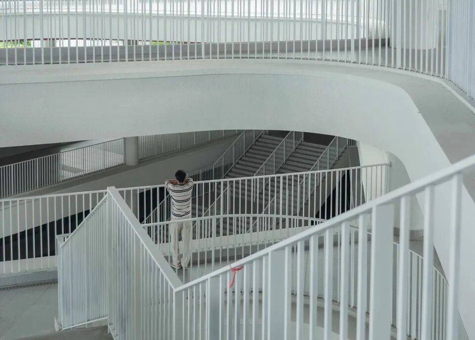2. 环形交通动线串联:教学楼、艺术楼、宿舍、大礼堂与运动场通过一系列环形交通动线串联,露台空间参与动线建构,将教学、艺术与生活空间织就成紧密联动的交通网络。