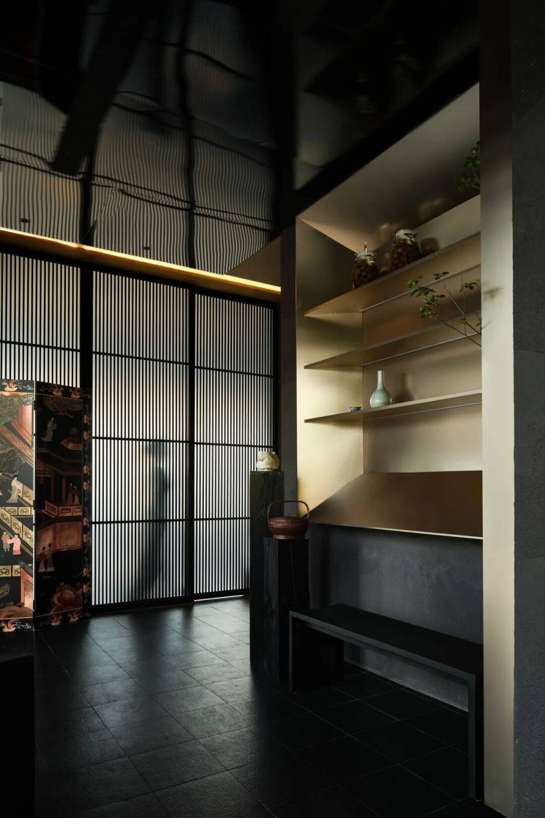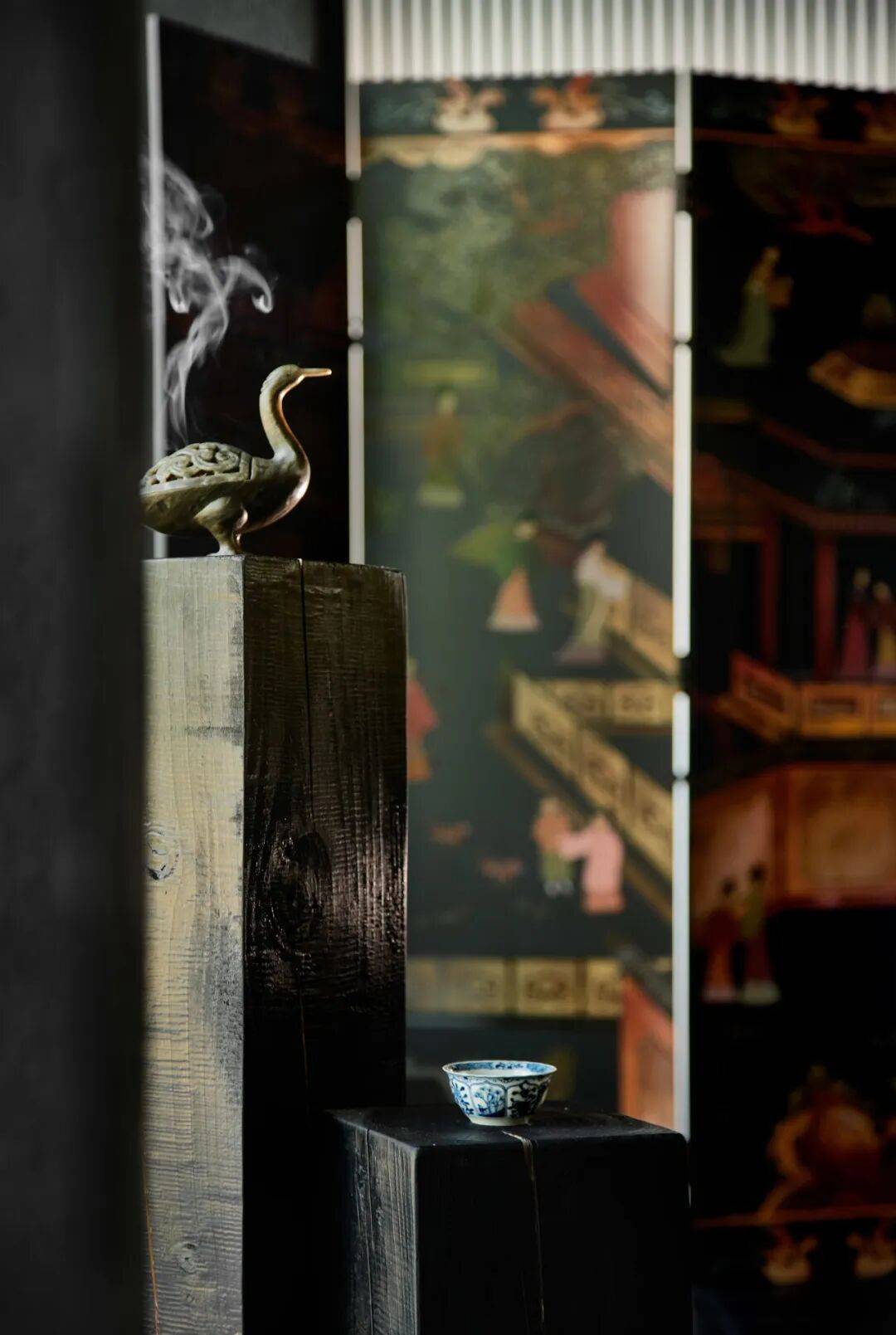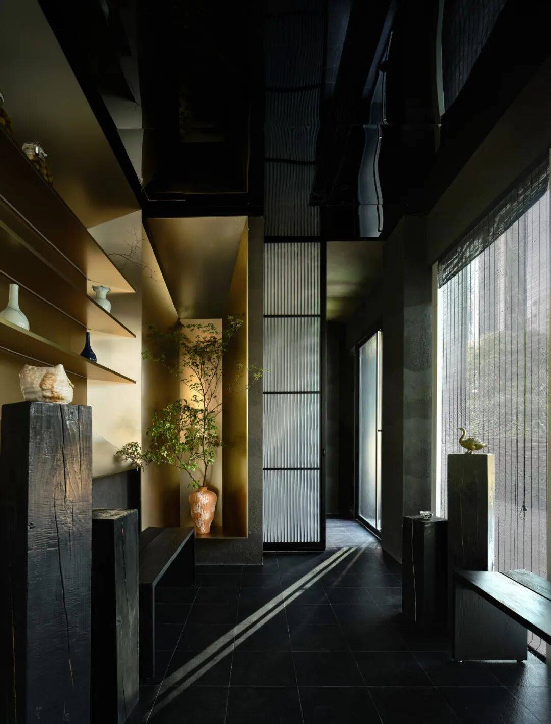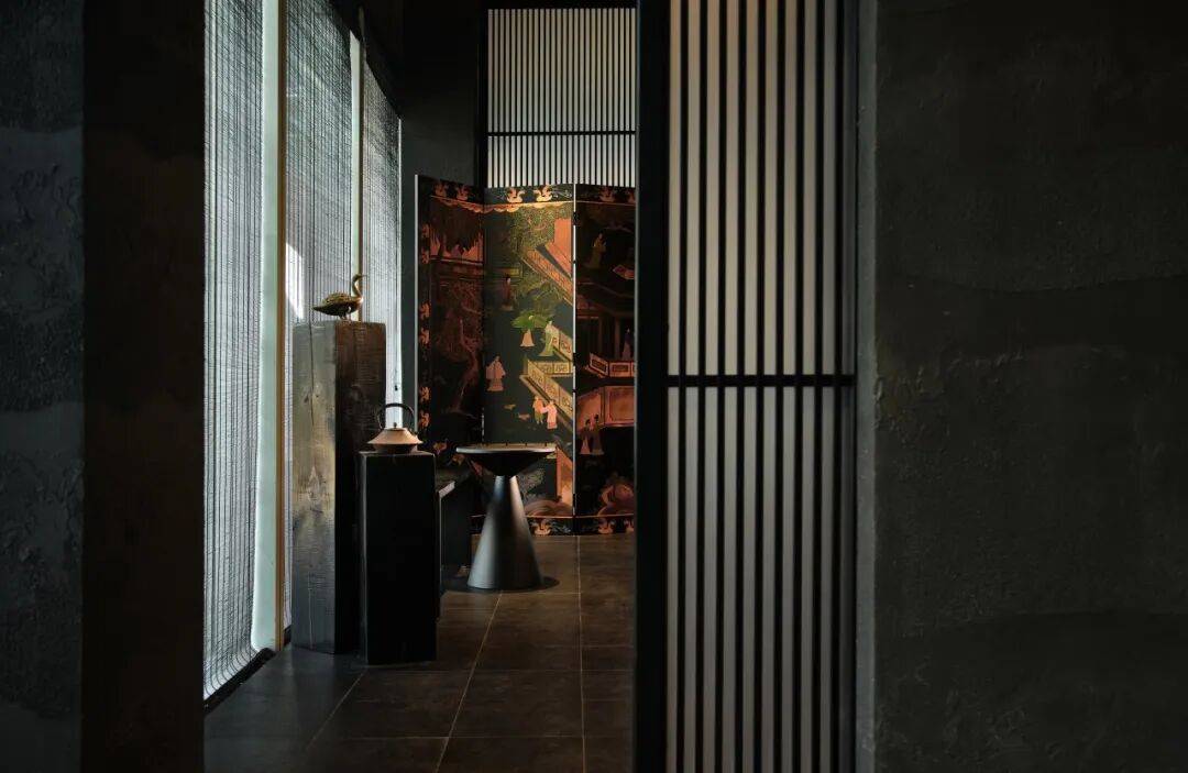 1. 前厅布局:步入前厅,曲径通幽的布局围合出人文骨架,以沉静姿态为后续主空间展开写下序章。铜色温润、老木沉厚、器物静默,共同铺陈出暗调场域,形、色、质浑然交融,淬炼出空间独特气质。