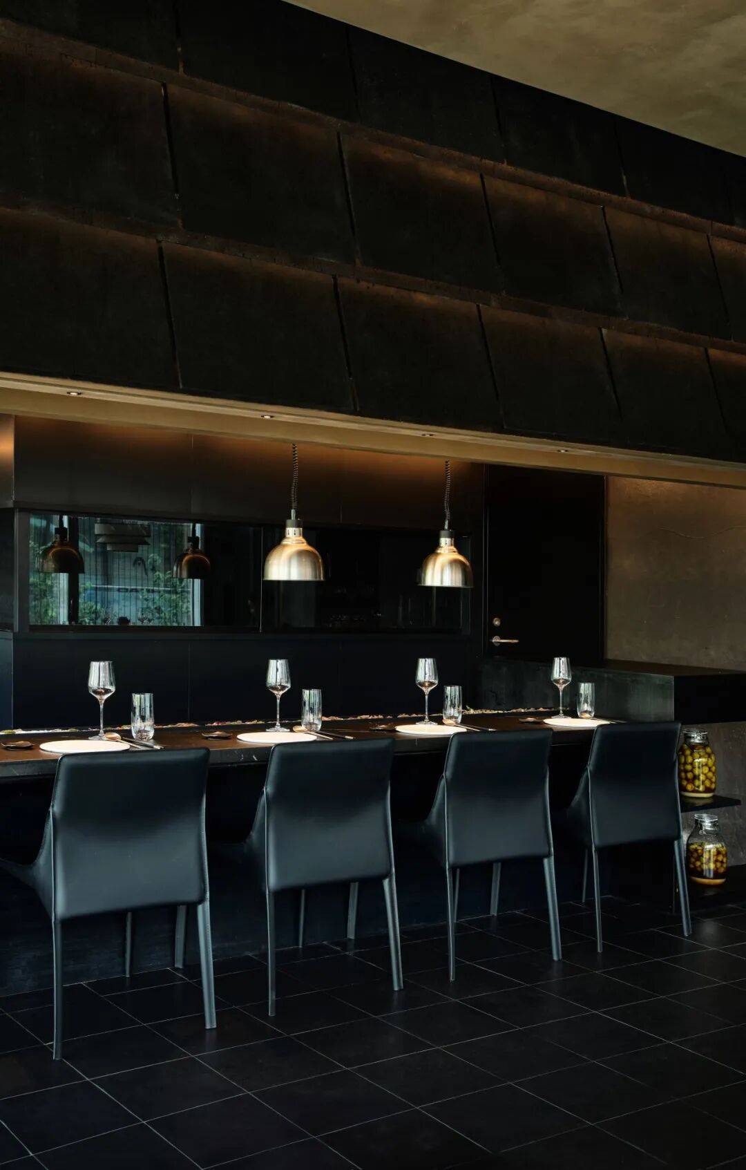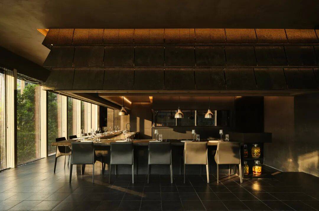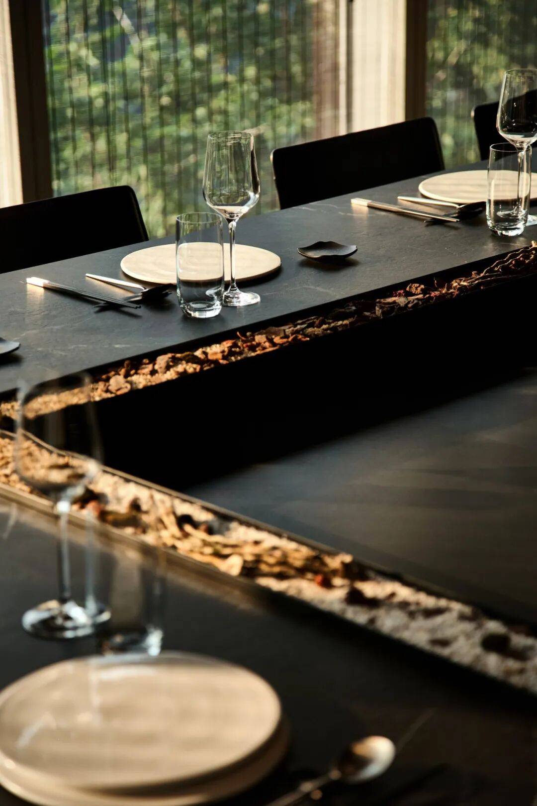材质对比融合:意大利岩板的现代精致与糅合花椒、玫瑰盐的粗犷夯土墙相映成趣,让食材成为空间语言,在视觉、味觉与嗅觉交融中,将用餐体验推向极致。