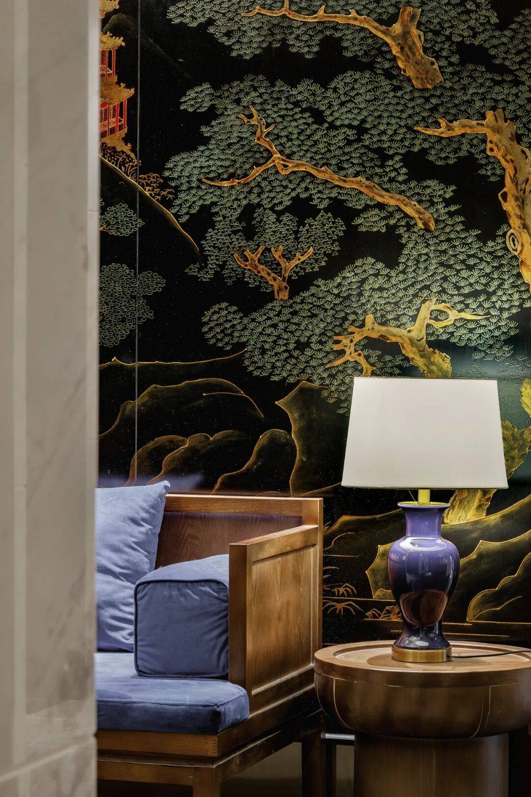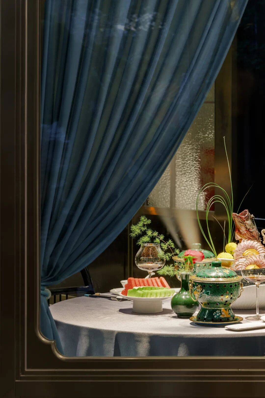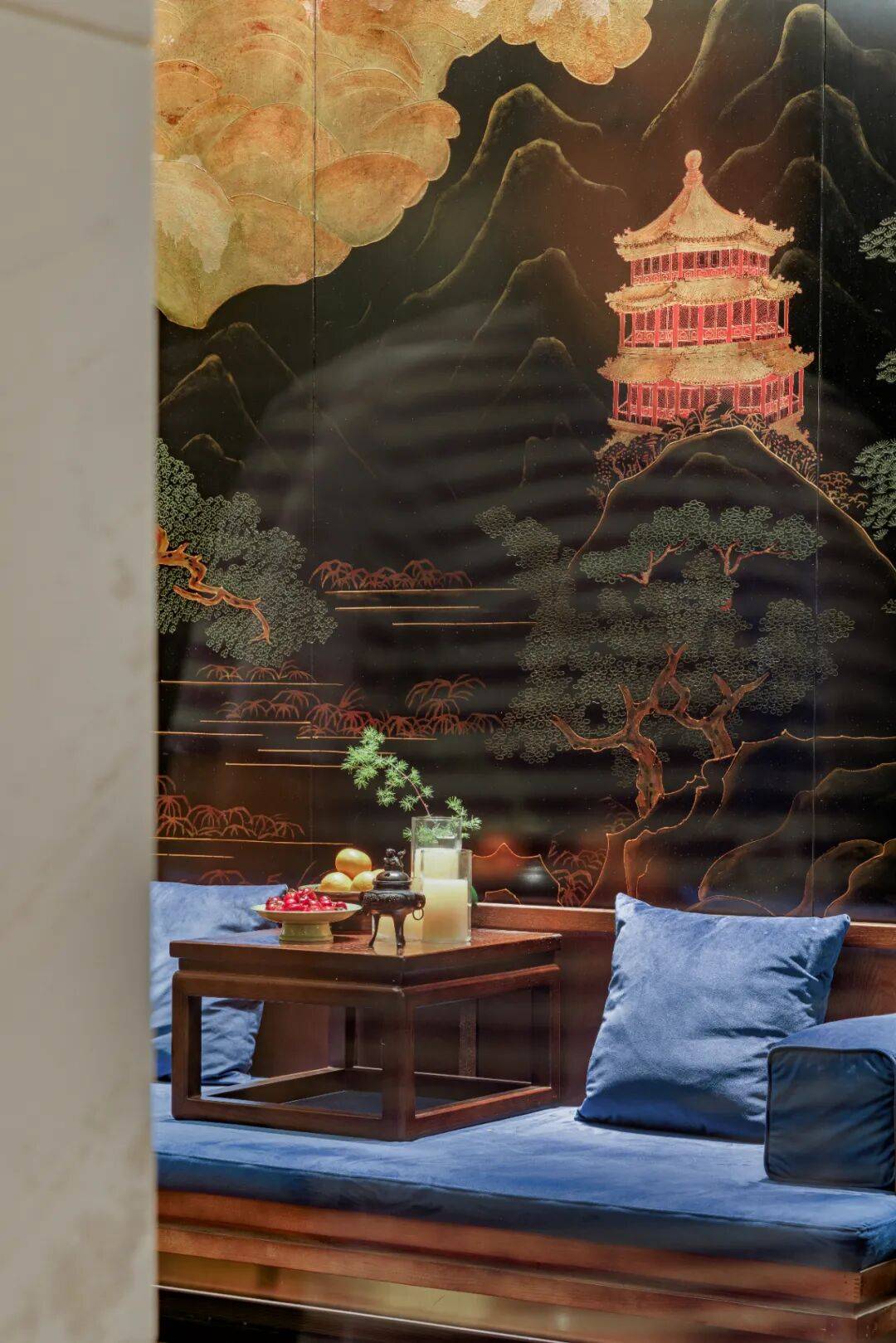 室内主要选用品牌标志性的渔蓝色与墨黑色,融入鎏金色串联穿插,彰显京派庄重与华贵并存的非凡气质。休息区特别呈现艺术家手工绘制的大漆壁画,描绘北京风貌的恢宏画卷。每间包间均设有专属北京文化主题,通过纸雕、珐琅、刺绣、铝板腐蚀等多种传统与当代工艺,精致再现颐和园、卢沟桥、燕山八景等京华印象,更陈列名家书法、京剧艺术与老北京影像,让文化在空间中流转,为每一次宴饮增添深厚底蕴与艺术价值。使文化于空间中流转可见,成为一场可感、可触、可品的时空之旅。