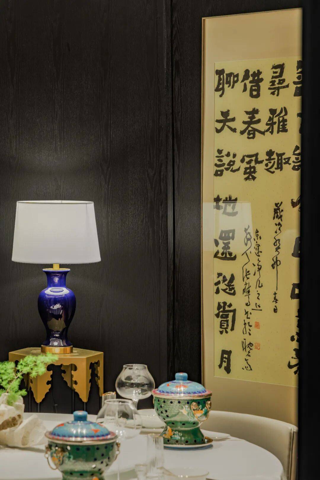 艺术陈列的沉浸感:包间内陈列名家书法、京剧艺术与老北京影像,通过多维度的艺术呈现,让宾客在宴饮中感受京城文化的深度与温度。