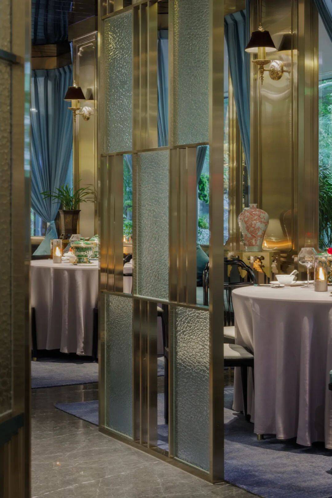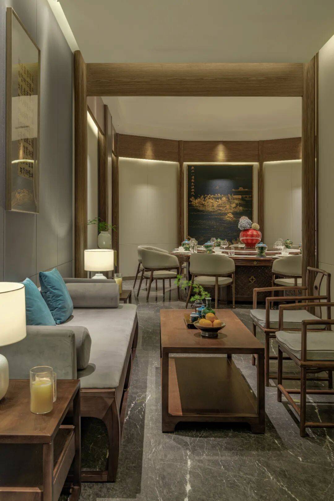“渔蓝”其名,意蕴深远。源于“渔歌互答”之宾主的闲适欢愉,亦取“蓝田生玉”之传承品牌精进之志。因餐厅地处首都宾馆这一文化窗口,设计团队以“京华气韵·雍雅气度”为主题,将空间视为一场深度感知首都文化的盛宴,使之成为以餐饮为媒介传播京味文化的现代载体。