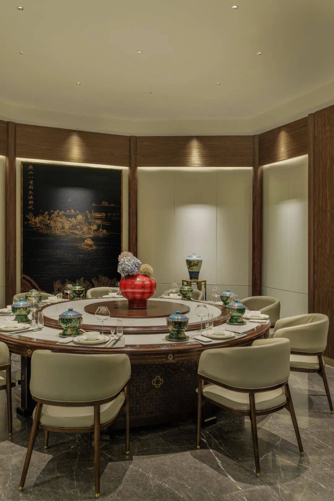 灯光与声学:包间内采用可调节灯光系统,营造不同用餐氛围;墙面材质与装饰工艺兼顾吸音效果,确保私密交谈的舒适性。