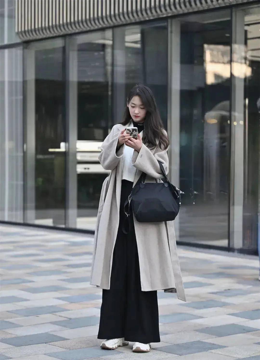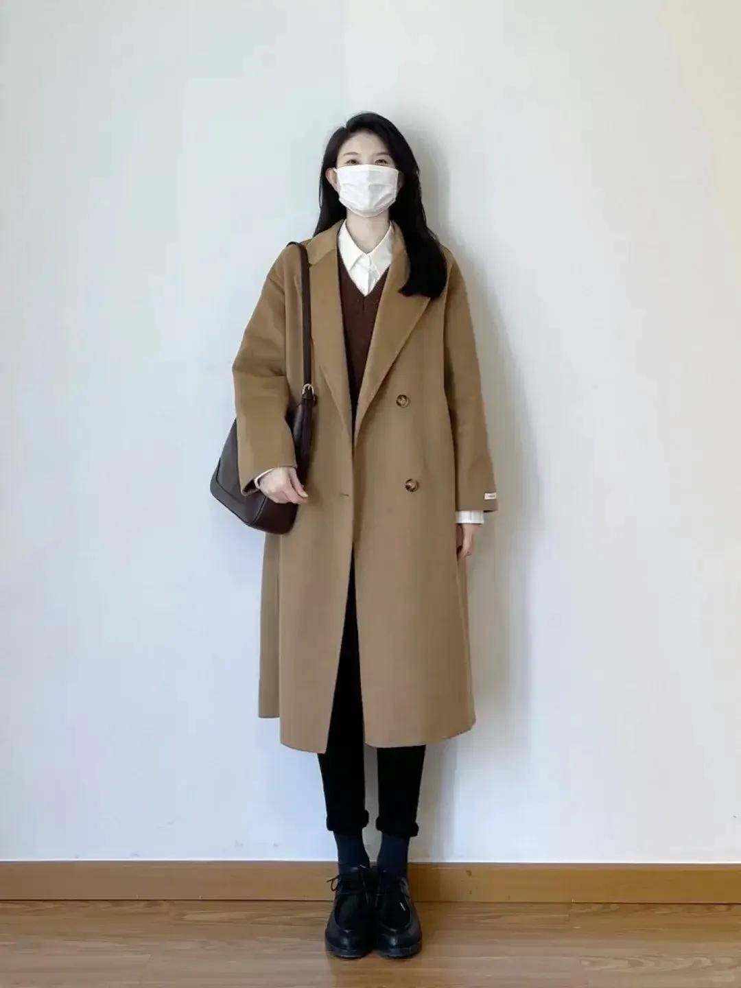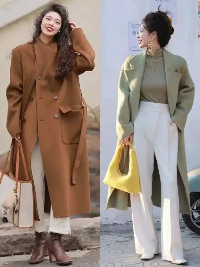 极简风:浅大地色大衣+白色阔腿裤+驼色皮鞋,简约大气,适合日常出门;
