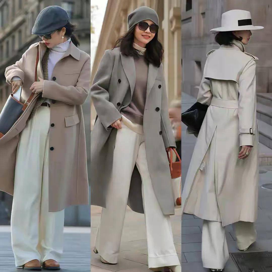 同色系/基础色,高级感翻倍:很少用花哨的颜色,大多以大地色(卡其、驼色、棕色)、黑白灰为主,偶尔用一点亮色点缀。比如三木妈妈穿的浅大地色大衣,搭配白色阔腿裤和驼色皮鞋,同色系的搭配让整体造型更和谐;三木女儿穿的蓝色大衣,搭配白色阔腿裤和白色皮鞋,蓝白配色清新脱俗,适合通勤或约会。