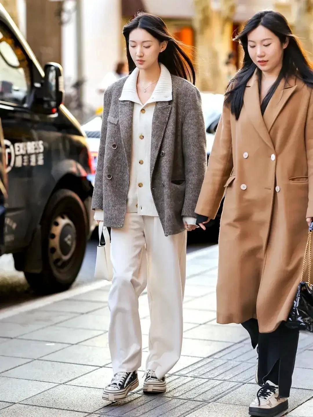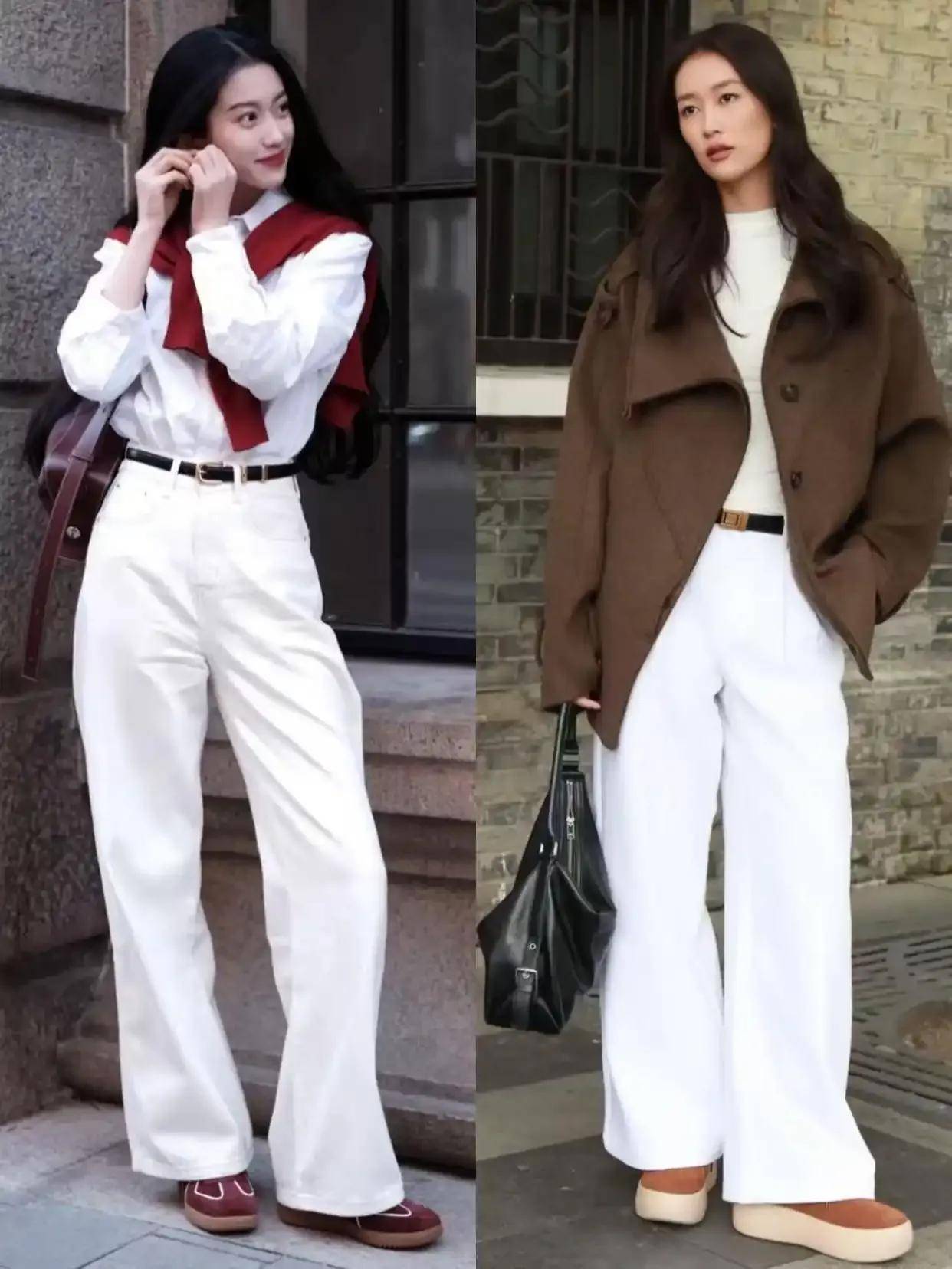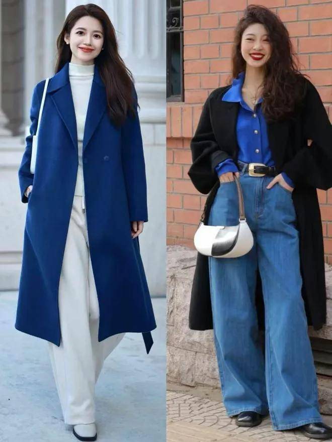 通勤风:蓝色大衣+白色西装阔腿裤+白色皮鞋,干练又不失优雅,适合上班或开会;