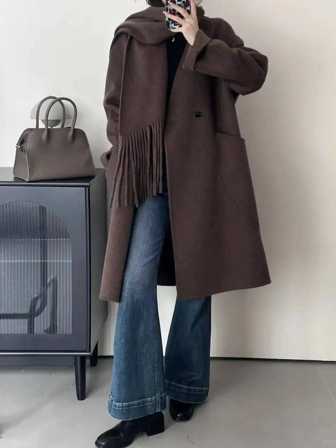 复古风:灯芯绒阔腿裤+毛衣+大衣,复古有质感,适合约会或参加活动;