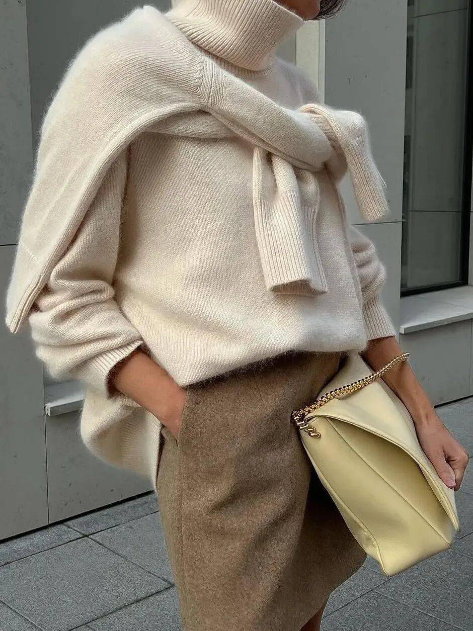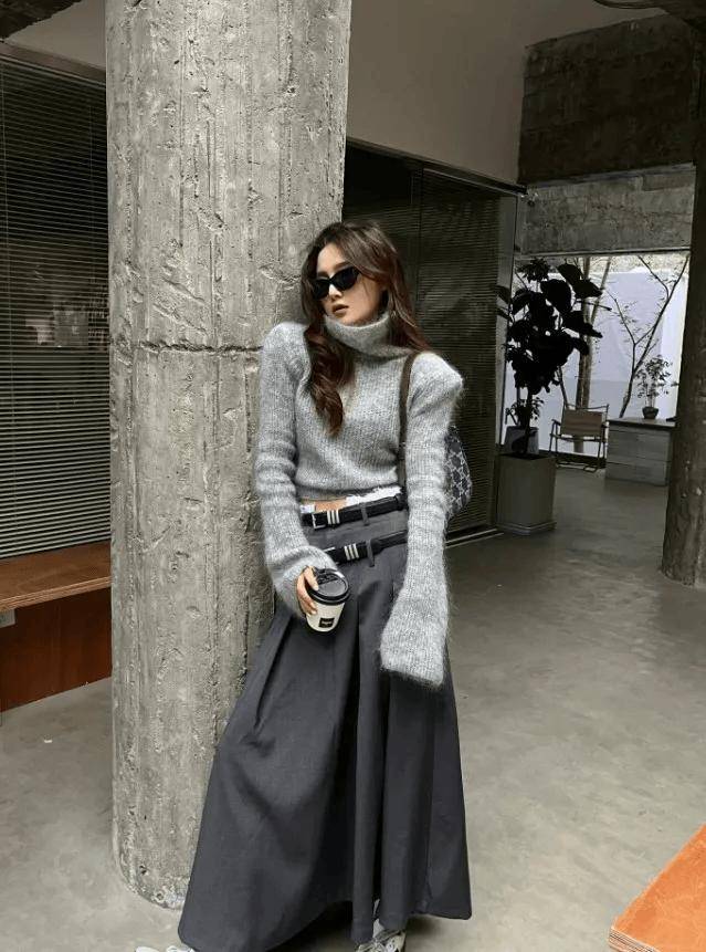 内层:选贴身薄款(如薄高领打底衫、紧身羊毛混纺毛衣),保暖且不占空间,贴合身形勾勒曲线;